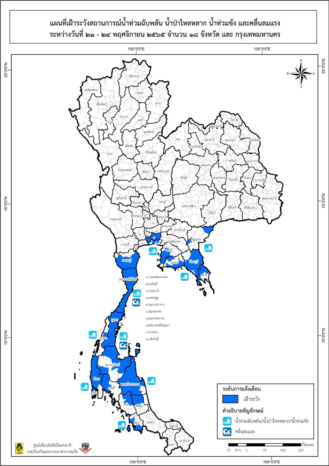 ปภ.แจ้ง 18 จังหวัดภาคกลาง ภาคตะวันออก ภาคใต้ และ กทม. เตรียมรับมือฝนตกหนัก เสี่ยงน้ำท่วมฉับพลัน น้ำท่วมขัง และคลื่นลมแรง ช่วงวันที่ 21-24 พ.ย.65