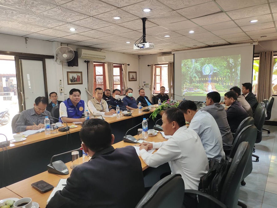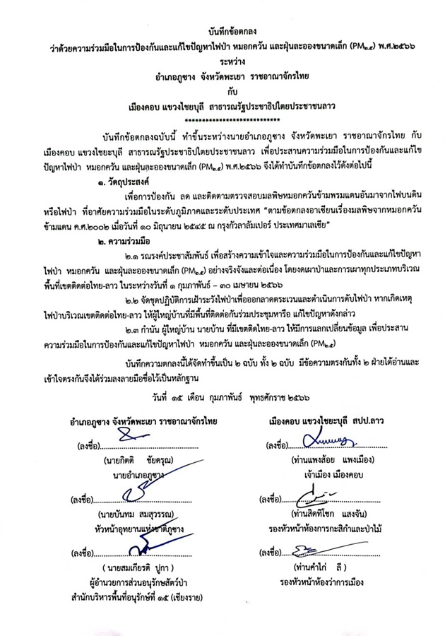 นายกิตติ กล่าวว่า ในการประชุมครั้งนี้สืบเนื่องมาจากปัญหาหมอกควันและไฟป่าที่ปีนี้ค่อนข้างจะรุนแรง โดยปัญหาที่เกิดขึ้นนี้ทำให้ชาวบ้านในพื้นที่ของ อ.ภูซาง ใช้ชีวิตกันอย่างยากลำบากด้วย ซึ่งในแต่ละวันตนเองก็ได้สั่งการให้ กำนัน ต.ภูซาง และทุ่งกล้วย ได้จัดเตรียมกำลังพลเพื่อเดินสำรวจว่ามีการลักลอบเผาป่าหรือไม่ นอกจากนี้ทางเจ้าหน้าที่ อช.ภูซาง ก็ตรึงกำลังเข้มเพื่อป้องกันปัญหาหมอกควัน ไฟป่านี้ด้วย ซึ่งล่าสุดทาง อ.ภูซาง ก็ได้มีการประชุมหารือกับทางเจ้าเมืองคอบ สปป.ลาว ในเรื่องของการป้องกันปัญหาดังกล่าวนี้ โดยได้มีการร่าง MOU และทำข้อตกลงร่วมกันซึ่งใจความสำคัญนั้นมีทั้งในเรื่องขอการประชาสัมพันธ์ไม่ให้มีการเผ่า รณรงค์ถึงผลเสียที่ตามมาโดยให้เริ่มทำหลังจากมีประกาศทางจังหวัดคือเริ่มตั้งแต่ 1 ก.พ.-30 เม.ย.66 ด้วย นอกจากนี้ก็ให้ทั้ง 2 พื้นทีได้จัดชุดออกลานตระเวนตามแนวชายแดนไทย-ลาวของเขต ต.ภูซาง และต.ทุ่งกล้วย เพื่อคอยสวดส่องดูแลในเรื่องของการลักลอบเผาด้วย รวมทั้งให้กำนัน-ผู้ใหญ่บ้านทั้ง 2 ประเทศได้มีการแลกเปลี่ยนข้อมูลในเรื่องของปัญหาหมอกควัน-ไฟป่าที่เกิดขึ้นในช่วงนี้ด้วย