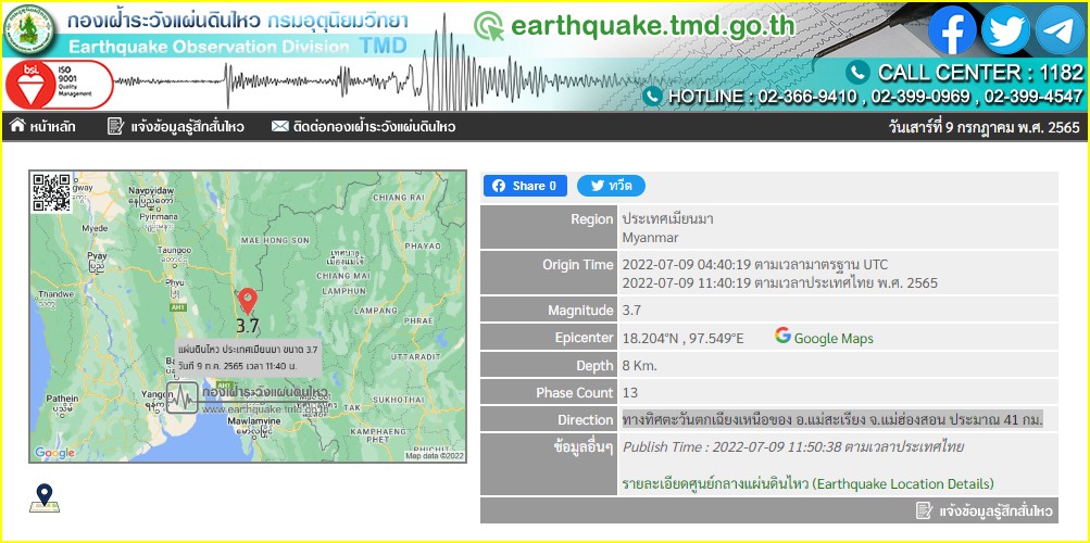 แผ่นดินไหว ประเทศเมียนมา(18.20°N,97.55°E) ขนาด 3.7 ลึก 8 กม. วันที่ 9 ก.ค. 2565 เวลา 11:40 น. [TMD] / ทางทิศตะวันตกเฉียงเหนือของ อ.แม่สะเรียง จ.แม่ฮ่องสอน ประมาณ 41 กม.