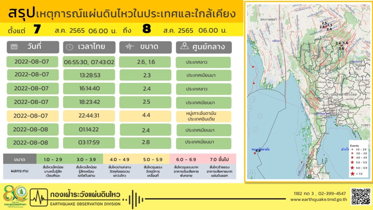 สำหรับสถานการณ์แผ่นดินไหวในช่วงวันที่ 7-8 สิงหาคม 2565 ตรวจพบเหตุการณ์แผ่นดินไหว ขนาด 2.6, 1.6, 2.4 มีศูนย์กลางอยู่ที่ประเทศลาว ขนาด 4.4 มีศูนย์กลางอยู่ที่หมู่เกาะอันดามัน ประเทศอินเดีย ขนาด 2.3, 2.5, 2.4, 2.8 มีศูนย์กลางอยู่ที่ประเทศเมียนมา ไม่มีผลกระทบต่อประเทศไทยแต่อย่างใด