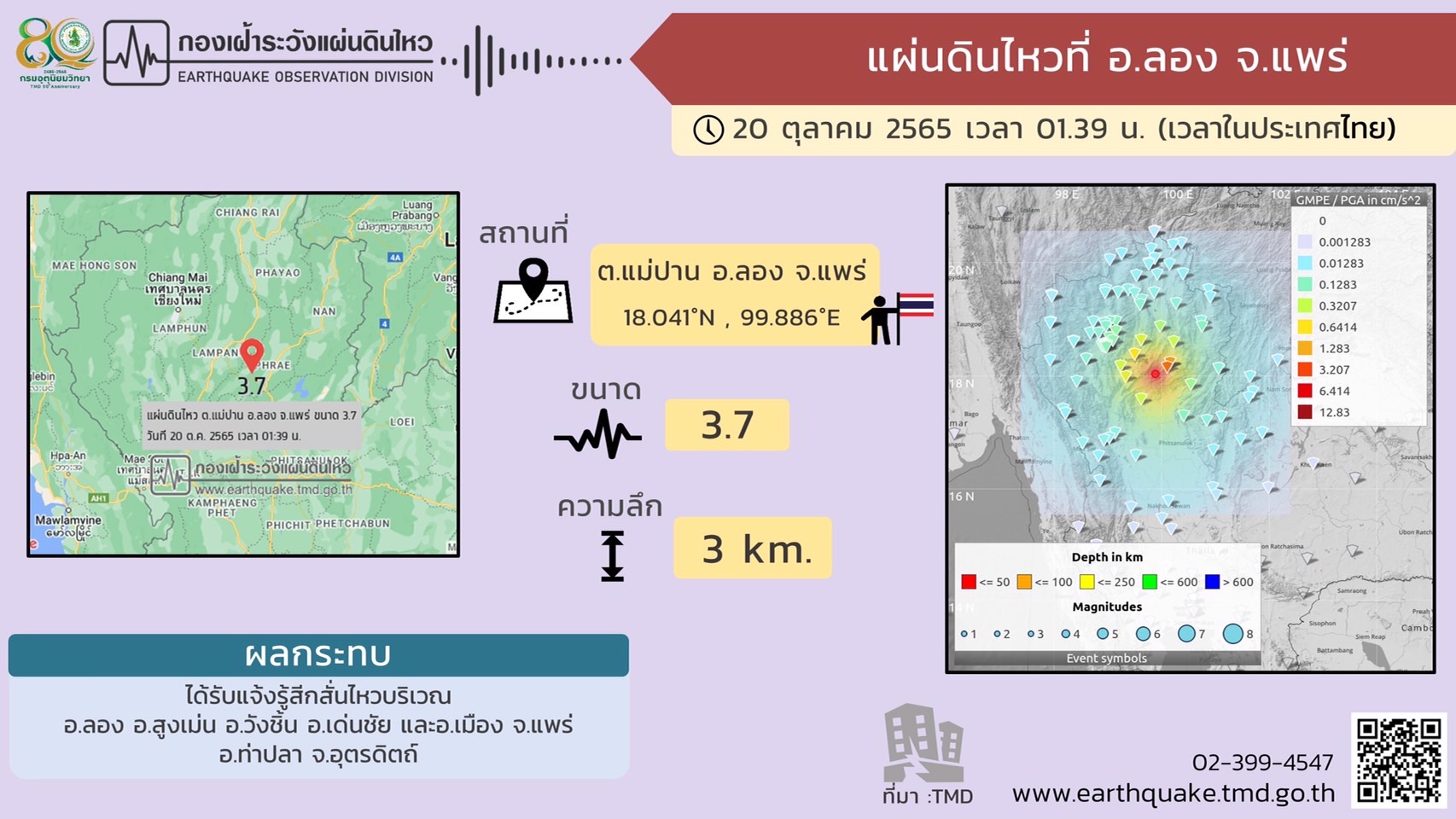 จ.ลำพูน (อ.เมือง และอ.บ้านธิ) ,จ.พะเยา (อ.ดอกคำใต้) ขนาด 2.9 มีศูนย์กลางอยู่ที่ ต.บ้านปิน อ.ลอง จ.แพร่ ได้รับแจ้งรู้สึกสั่นไหวบริเวณ จ.แพร่ (อ.ลอง)