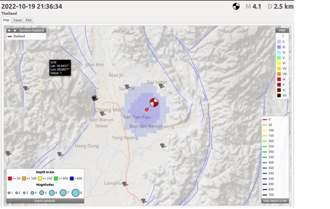 เมื่อวันที่ 20 ตุลาคม 2565 เวลา 4:36 น. ที่ผ่านมา ได้เกิดเหตุการณ์แผ่นดินไหว ณ ต.แม่คือ อ.ดอยสะเก็ด จ.เชียงใหม่ ขนาด M4 ที่ความลึก 2 km บริเวณกลุ่มของรอยเลื่อนแม่ทา (รูปที่ 1) ซึ่งจัดอยู่ในแผ่นดินไหวขนาดเบา (Light) ตามมาตรฐานของ United States Geological Survey (USGS) ที่สามารถรับรู้การสั่นไหวได้ แต่ไม่ก่อให้เกิดความเสียหายต่อตัวอาคารบ้านเรือน อีกทั้งจะเห็นได้จากผลการวิเคราะห์เบื้องต้นของกองเฝ้าระวังแผ่นดินไหว กรมอุตุนิยมวิทยา ซึ่งรายงานมาตราวัดความเข้มของการสั่นไหว หรือ Modified Mercalli Intensity (MMI) เพียง MMI 3 เท่านั้น (พื้นที่สีม่วงเข้ม; รูปที่ 2)