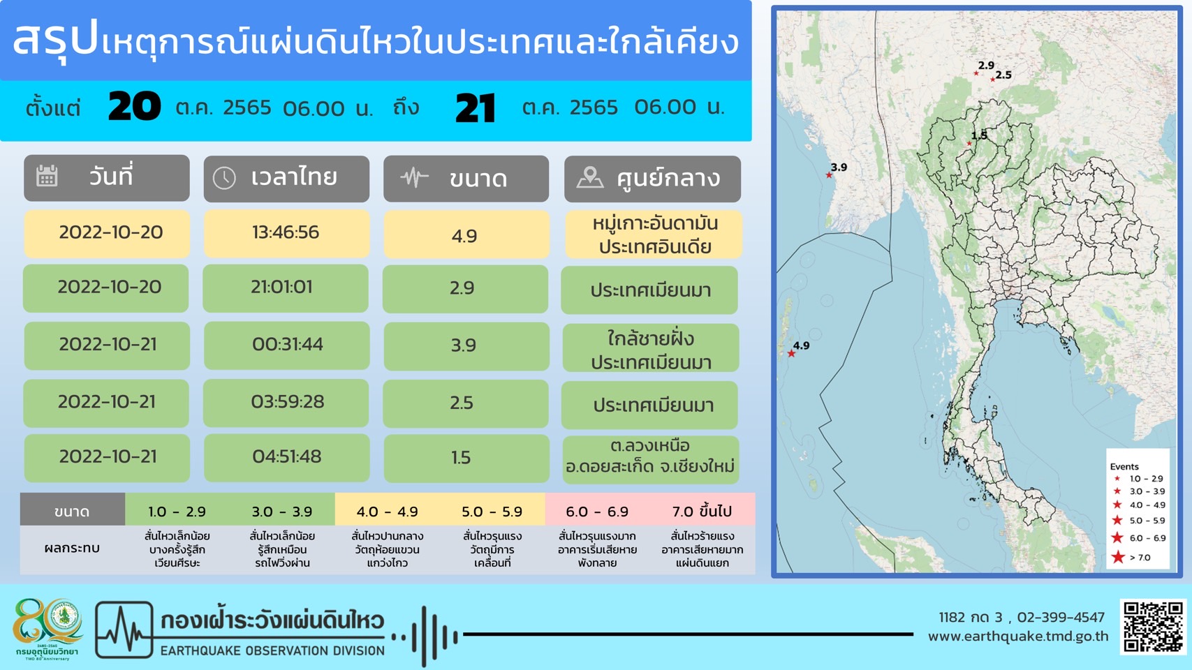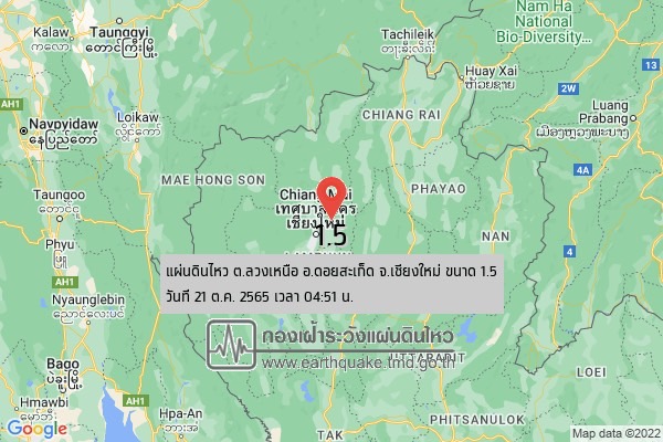 สำหรับสถานการณ์แผ่นดินไหว ในช่วงวันที่ 20-21 ตุลาคม 2565 ตรวจพบเหตุการณ์แผ่นดินไหว ขนาด 4.9 มีศูนย์กลางอยู่ที่ หมู่เกาะอันดามัน ประเทศอินเดีย ขนาด 2.9, 2.5 มีศูนย์กลางอยู่ที่ประเทศเมียนมา ขนาด 3.9 มีศูนย์กลางอยู่ที่ใกล้ชายฝั่งประเทศเมียนมา ทางทิศตะวันตกเฉียงใต้ของ อ.สบเมย จ.แม่ฮ่องสอน ประมาณ 381 กม.และขนาด 1.5 มีศูนย์กลางอยู่ที่ ต.ลวงเหนือ อ.ดอยสะเก็ด จ.เชียงใหม่ ไม่มีผลกระทบต่อประเทศไทยแต่อย่างใด