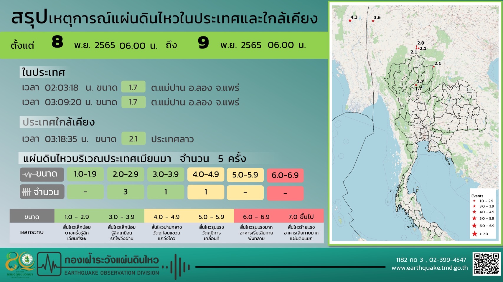 สถานการณ์แผ่นดินไหวในช่วงวันที่ 8-9 พฤศจิกายน 2565 ตรวจพบเหตุการณ์แผ่นดินไหว ขนาด 4.3, 3.6, 2.0, 2.1 และ 2.1 มีศูนย์กลางอยู่ที่ประเทศเมียนมา ขนาด 1.7 และ 1.7 มีศูนย์กลางอยู่ที่ ต.แม่ปาน อ.ลอง จ.แพร่ ขนาด 2.1 มีศูนย์กลางอยู่ที่ประเทศลาว ซึ่งเป็นแผ่นดินไหวขนาดเล็ก ไม่มีผลกระทบต่อประเทศไทยแต่อย่างใด
