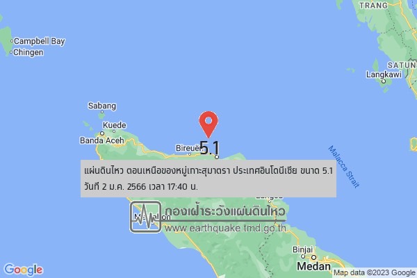 แผ่นดินไหว ตอนเหนือของหมู่เกาะสุมาตรา ประเทศอินโดนีเซีย (Northern Sumatra, Indonesia) วันจันทร์ที่ 2 มกราคม พ.ศ. 2566 เวลา 17:40 น. ตามเวลาประเทศไทย (2023-01-02 10:40:00 UTC)