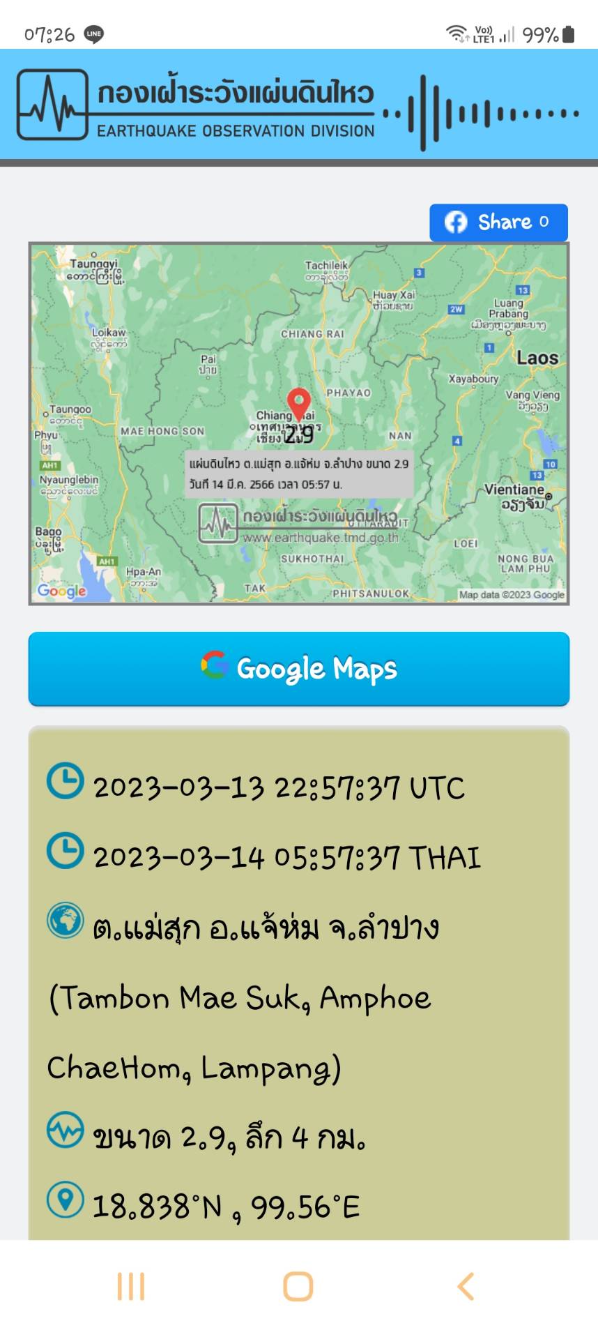 แผ่นดินไหว 2023-03-14 05:57:37 น. ต.แม่สุก อ.แจ้ห่ม จ.ลำปาง (Tambon Mae Suk, Amphoe ChaeHom, Lampang) ขนาด 2.9 ลึก 4 กม. https://earthquake.tmd.go.th/inside-info.html?earthquake=10777