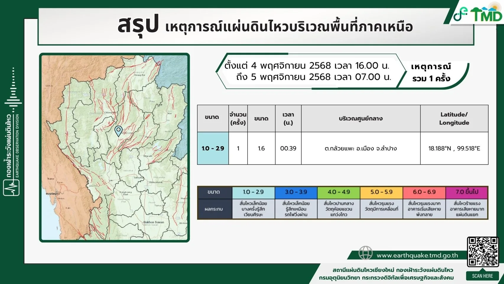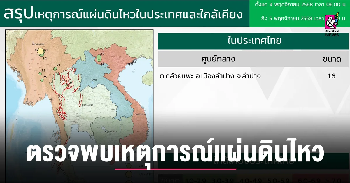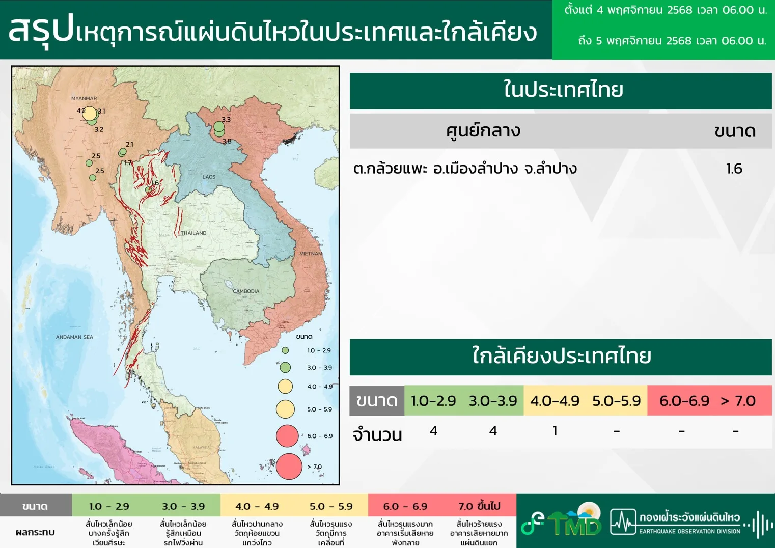 สำหรับสถานการณ์แผ่นดินไหวในช่วงวันที่ 4-5 พฤศจิกายน 2568 ตรวจพบเหตุการณ์แผ่นดินไหว ขนาด 4.2, 2.5, 3.1, 2.1, 1.7, 3.2, 2.5 มีศูนย์กลางอยู่ที่ประเทศเมียนมา ขนาด 3.8, 3.3 มีศูนย์กลางอยู่ที่ประเทศเวียดนาม และขนาด 1.6 มีศูนย์กลางอยู่ที่ ต.กล้วยแพะ อ.เมืองลำปาง จ.ลำปาง ไม่มีผลกระทบต่อประเทศไทยแต่อย่างใด