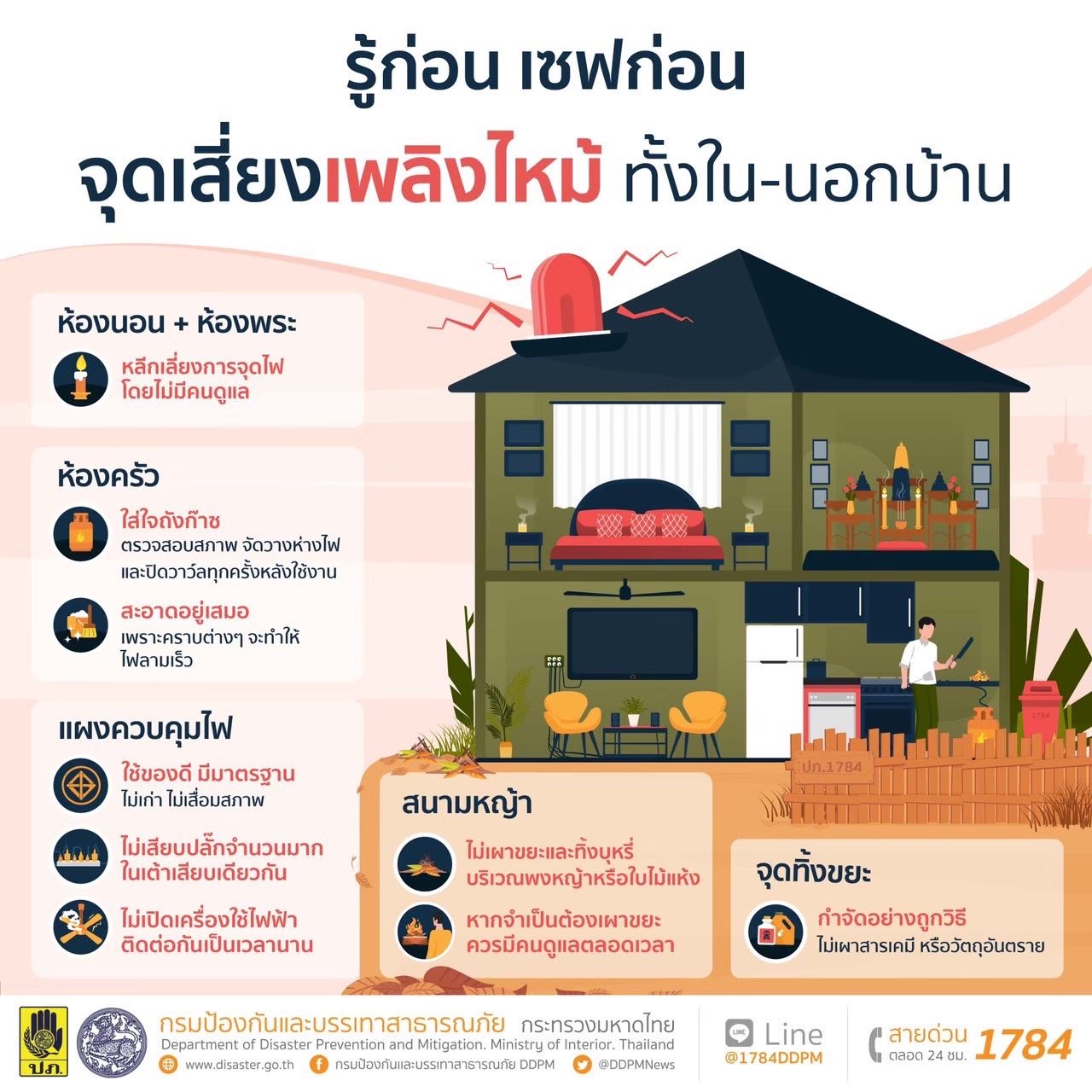 กรมป้องกันและบรรเทาสาธารณภัย แนะประชาชนเพิ่มความระมัดระวังพิเศษในการประกอบกิจกรรมเกี่ยวกับไฟทุกประเภท พร้อมทั้งตรวจสอบอุปกรณ์ไฟฟ้าและสายไฟฟ้าให้สามารถใช้งานได้อย่างปลอดภัย ไม่เปิดเครื่องใช้ไฟฟ้าทิ้งไว้ ถอดปลั๊กไฟทุกครั้งหลังใช้งาน ดับก้นบุหรี่ให้สนิทก่อนทิ้งทุกครั้ง ไม่เผาขยะและหญ้าแห้งในที่โล่งแจ้ง รวมถึงใช้ก๊าซหุงต้มหรือเตาแก๊สประกอบอาหารด้วยความระมัดระวังและตรวจสอบทุกครั้งหลังใช้งาน จะช่วยลดความเสี่ยงต่อการเกิดเพลิงไหม้ได้