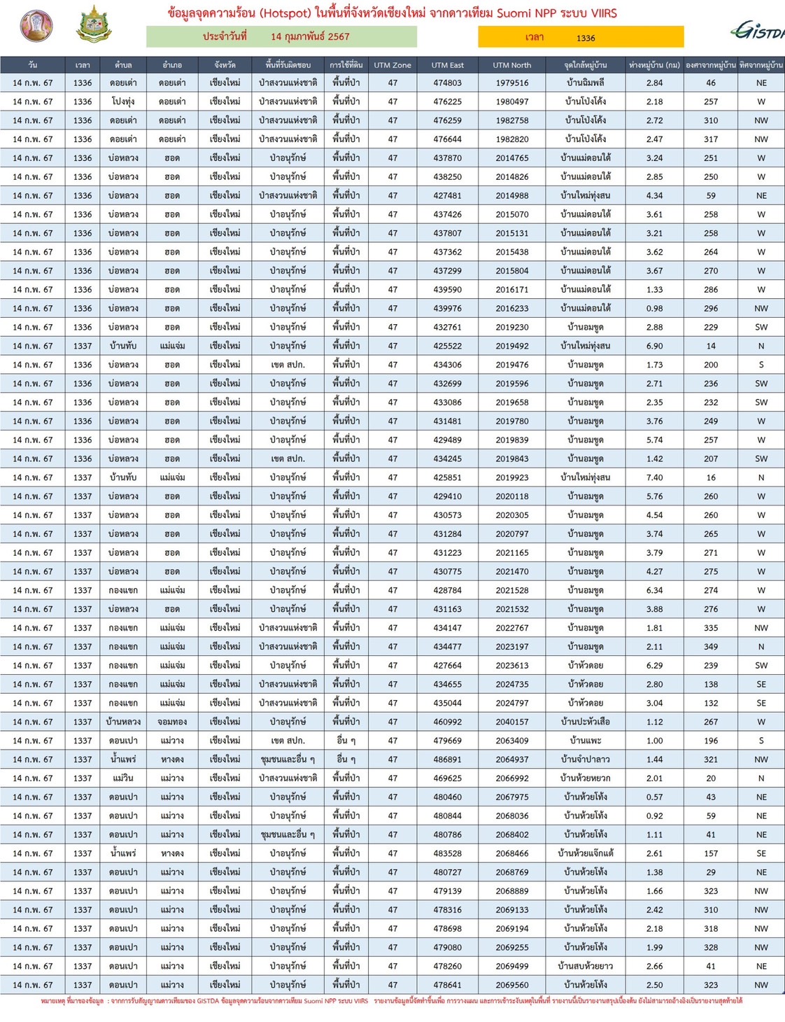 เมื่อช่วงบ่ายวันที่ 14 ก.พ.2567 สภาพอากาศที่เริ่มร้อนจัด อยูที่ 33 -34 องศาเซลซียส ส่งผลให้เกิดจุดความร้อนเพิ่ม จากศูนย์บัญชาการไฟป่า หมอกควันและฝุ่นpm2.5 จังหวัดเชียงใหม่ รายงานจุดความร้อน (Hotspot) ประจำวันที่ 14 กุมภาพันธ์ 2567 รอบบ่ายจังหวัดเชียงใหม่พบจุดความร้อน จำนวน 49 จุดพบในพื้นที่อำเภอฮอด 22 จุด อำเภอแม่วาง 12 จุด อำเภอแม่แจ่ม 8 จุด อำเภอดอยเต่า 4 จุด อำเภอหางดง 2 จุด และอำเภอจอมทอง 1 จุด ส่วนจุดความร้อนสะสมตั้งแต่วันที่ 1 ม.ค. 2567 ถึงปัจจุบันทั้งหมดจำนวน 214 จุด จากการตรวจสอบพบว่าเกิดในพื้นที่ป่าอนุรักษ์ ป่าสงวนแห่งชาติ เขตสปก. เกิดในชุมชนและอื่นๆ