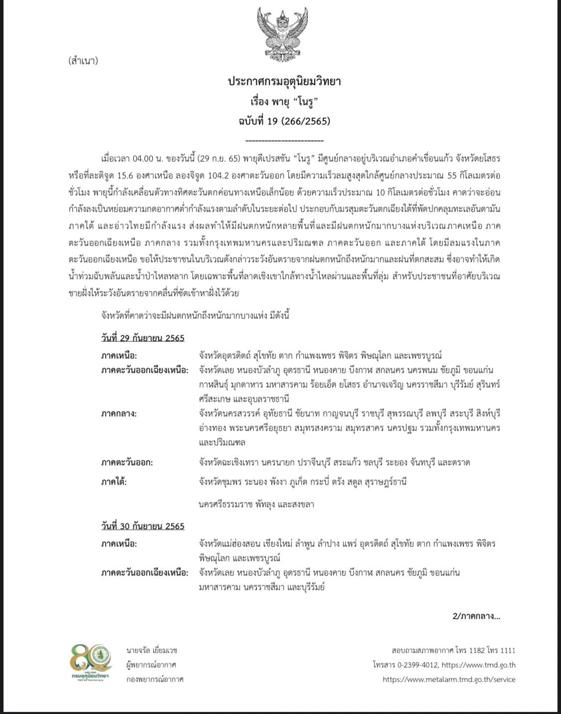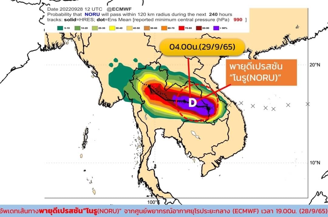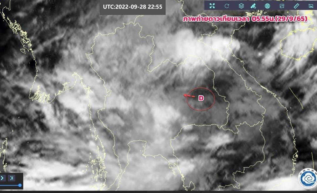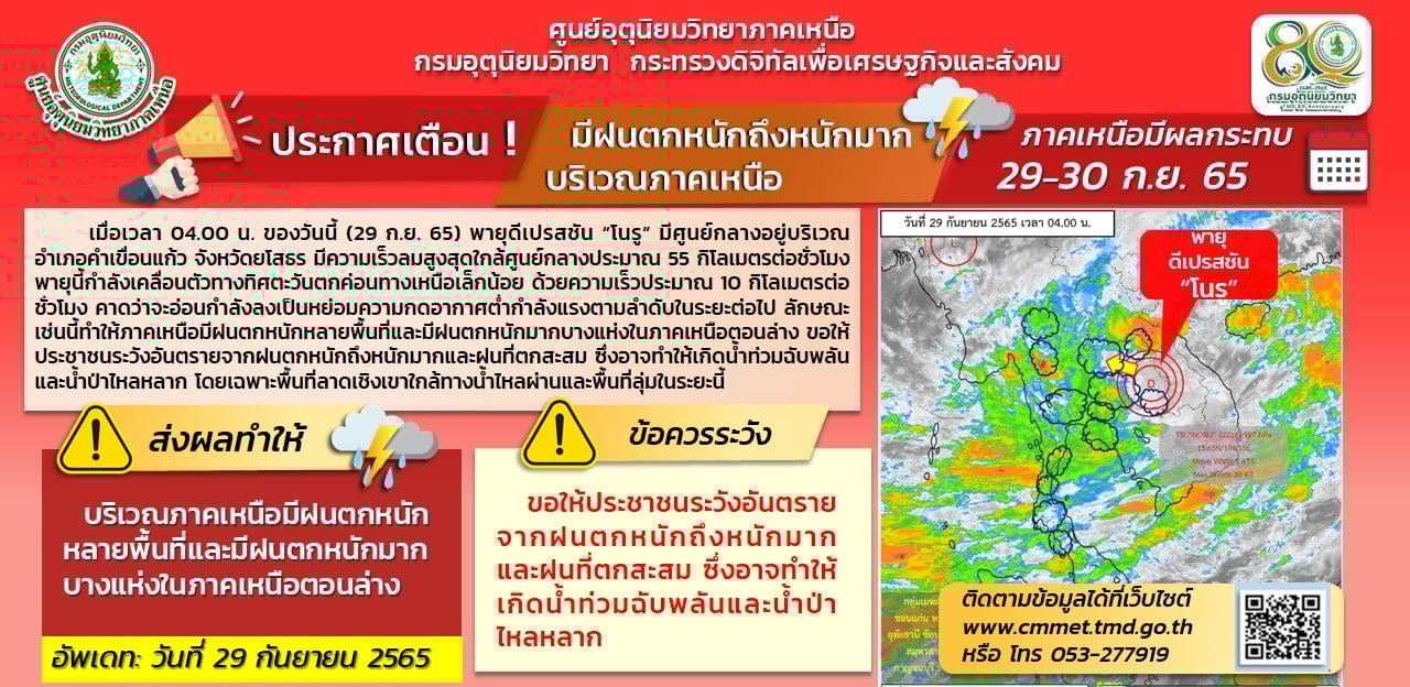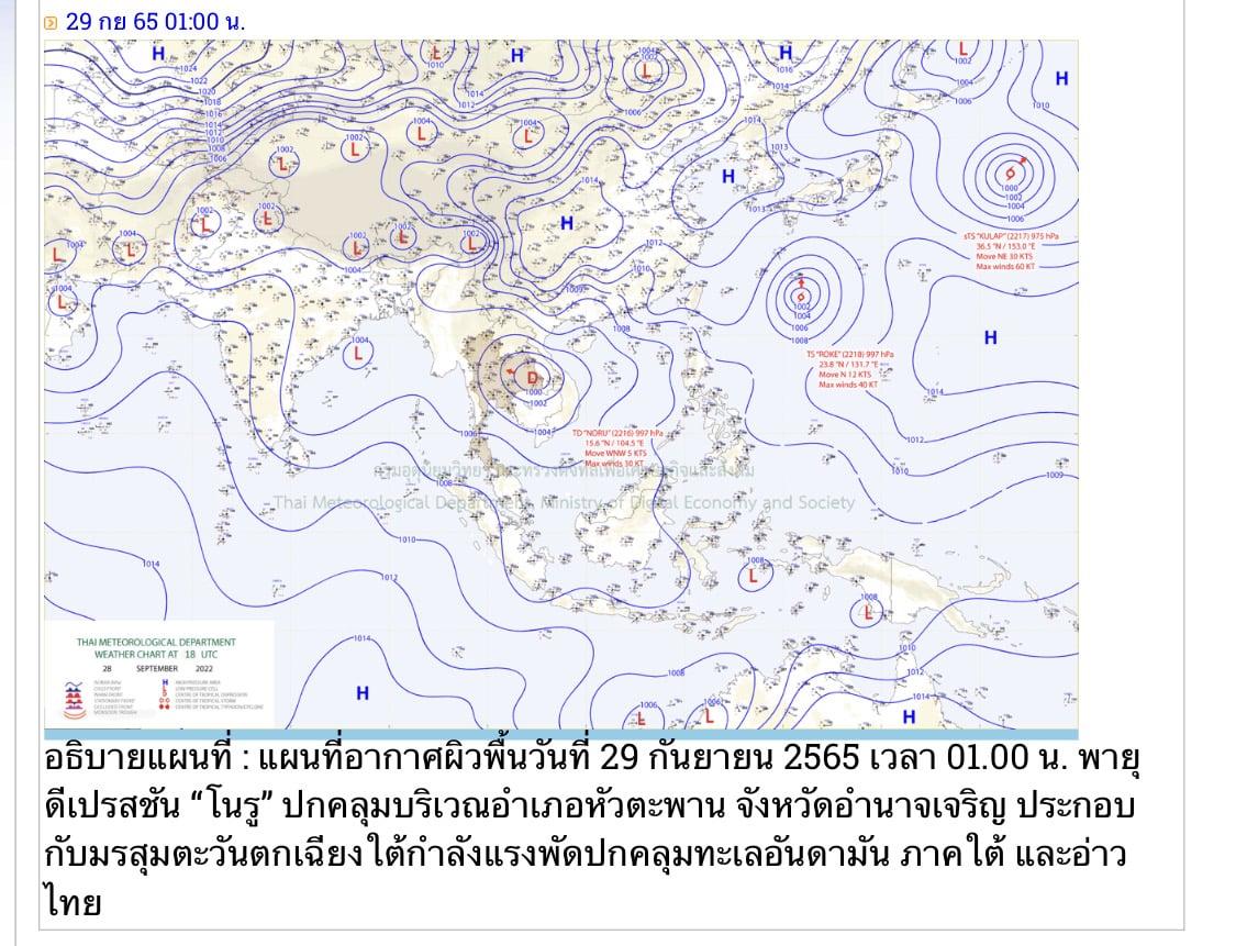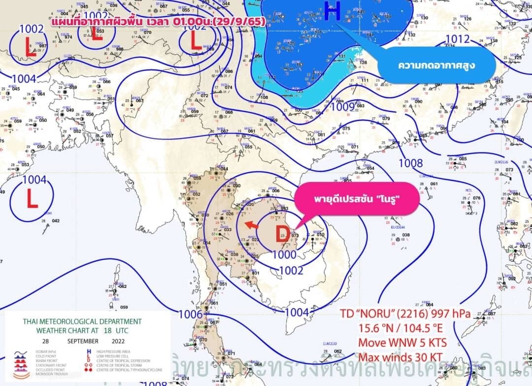 พายุดีเปรสชัน “โนรู” มีศูนย์กลางอยู่บริเวณ อ.คำเขื่อนแก้ว จ.ยโสธร พายุนี้กำลังเคลื่อนตัวทางทิศตะวันตกค่อนทางเหนือเล็กน้อย ด้วยความเร็วประมาณ 15 กม./ชม. คาดว่าจะอ่อนกำลังลงเป็นหย่อมความกดอากาศต่ำกำลังแรงในวันนี้ (29/9/65)
