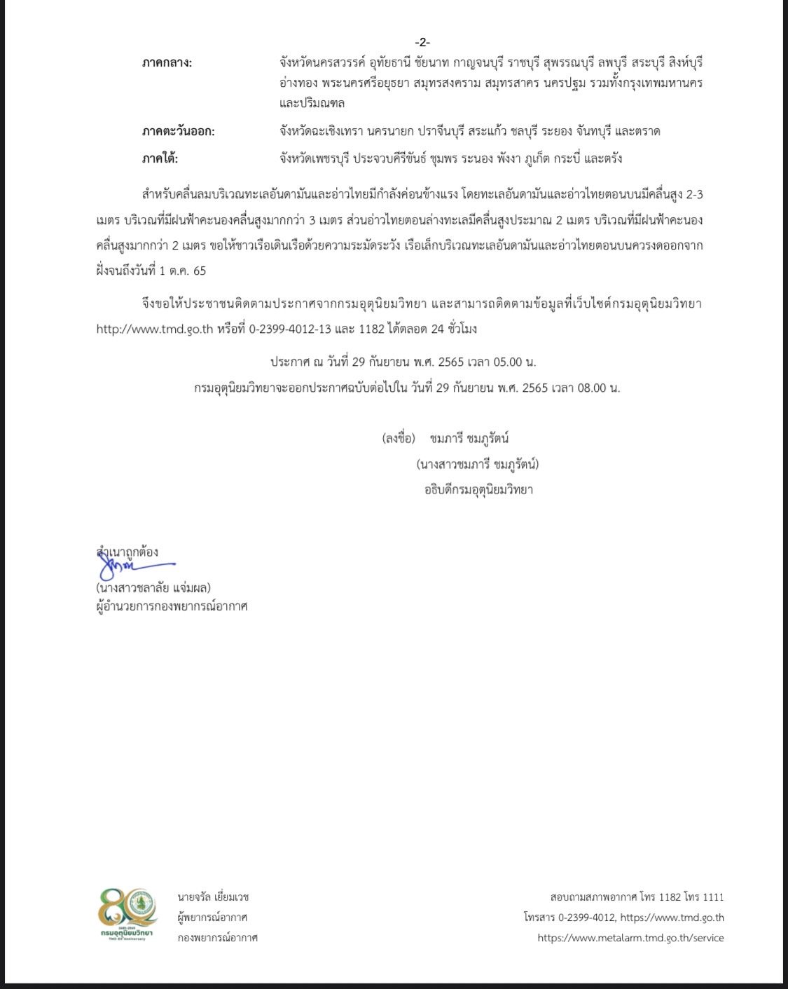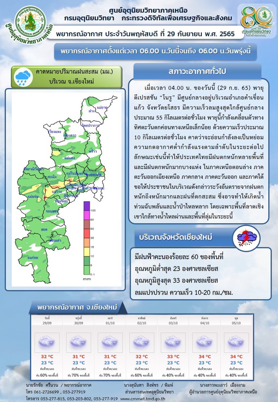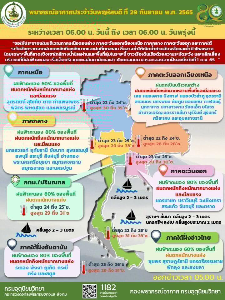 ประกอบกับมรสุมตะวันตกเฉียงใต้ กำลังแรงพัดปกคลุมทะเลอันดามัน ภาคใต้ และอ่าวไทย ทำให้ประเทศไทยมีฝนตกหนักหลายพื้นที่ และมีฝนตกหนักบางแห่ง ในภาคเหนือตอนล่าง ภาคอีสานด้านตะวันตก ภาคกลาง (รวม กทม.และปริมณฑล) ภาคตะวันออก และภาคใต้ฝั่งตะวันตก ขอให้ประชาชนในบริเวณดังกล่าว ระวังอันตรายจากฝนตกหนักและฝนที่ตกสะสม ซึ่งอาจทำให้เกิดน้ำท่วมฉับพลันและน้ำป่าไหลหลาก โดยเฉพาะพื้นที่ลาดเชิงเขาใกล้ทางน้ำไหลผ่านและพื้นที่ลุ่ม อิทธิพลของพายุยังมีผลกระทบถึงวันที่ 30 ก.ย.65 จากนั้นฝนที่ตก จะมาจากหย่อมความกดอากาศต่ำและมรสุมตะวันตกเฉียงใต้