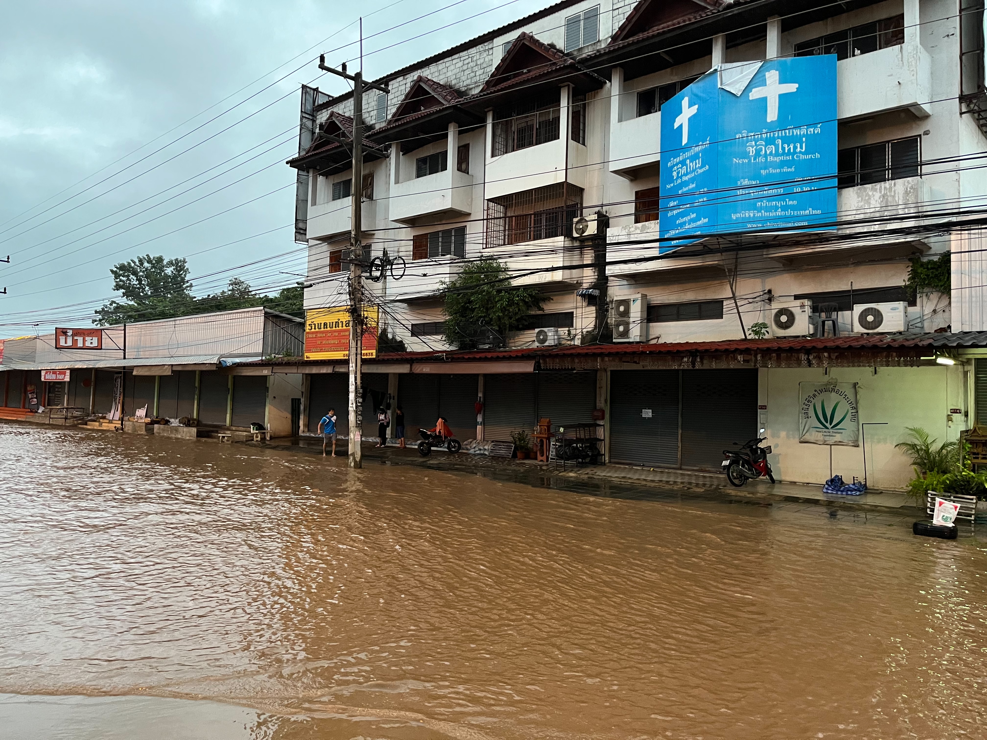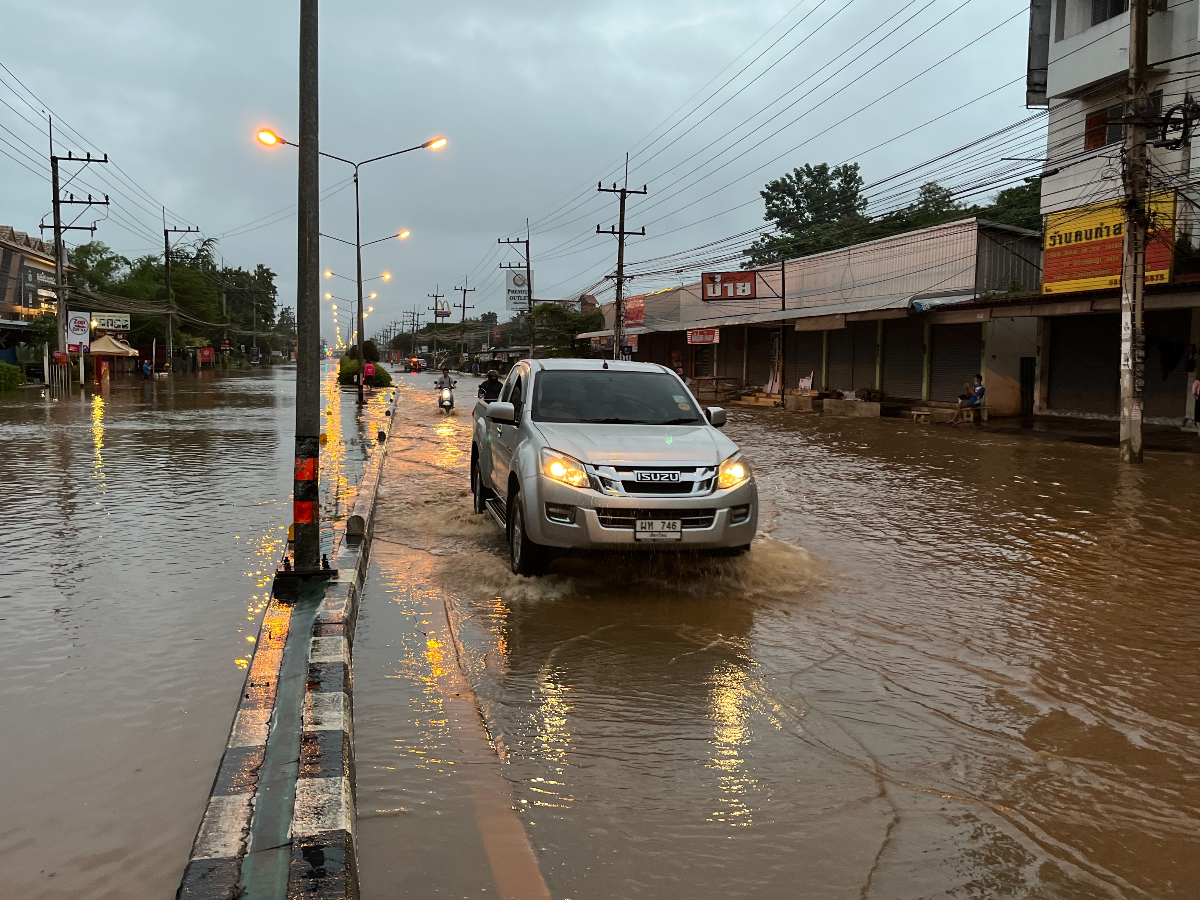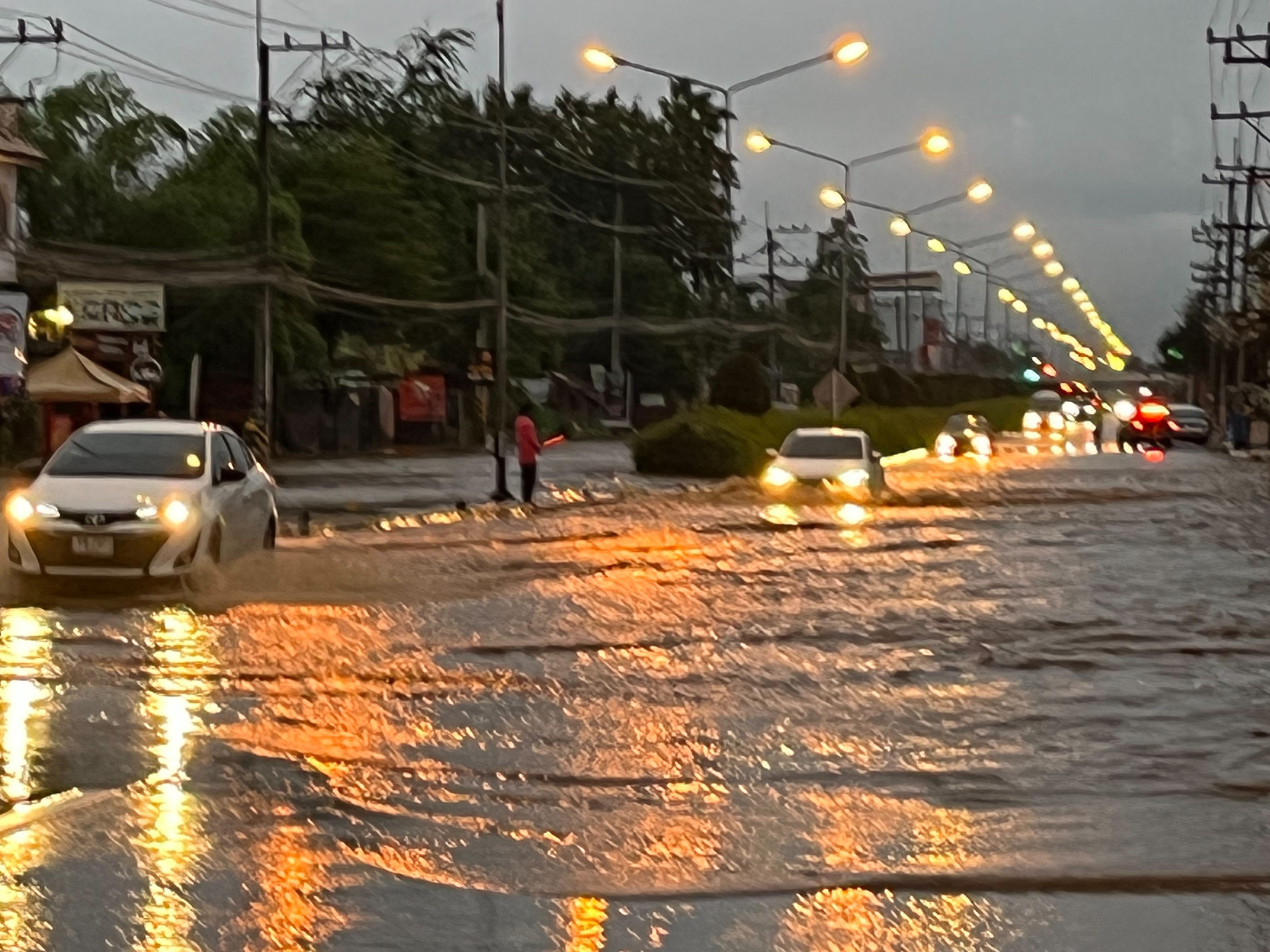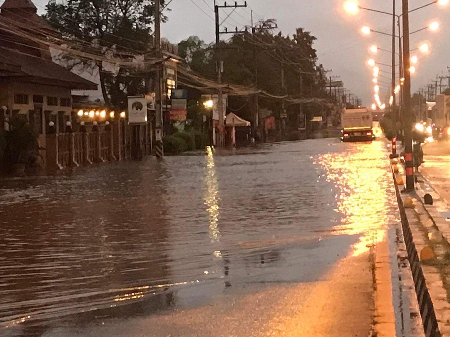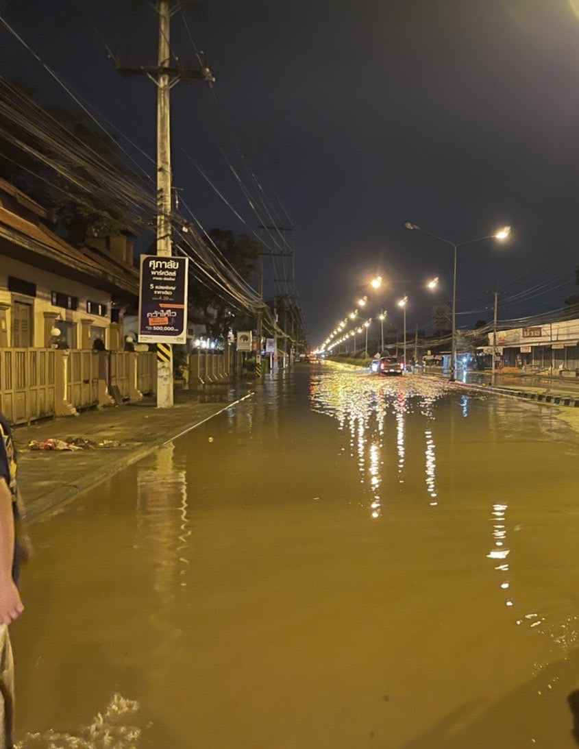 เจ้าหน้าที่ปิดถนนสายหางดง ขาเข้าเมือง จุดบ้านช่างคำ เพราะน้ำเริ่มสูงขึ้นรถยนต์เล็กไม่สามารถผ่านได้ น้ำสูงกว่าครึ่งเมตร