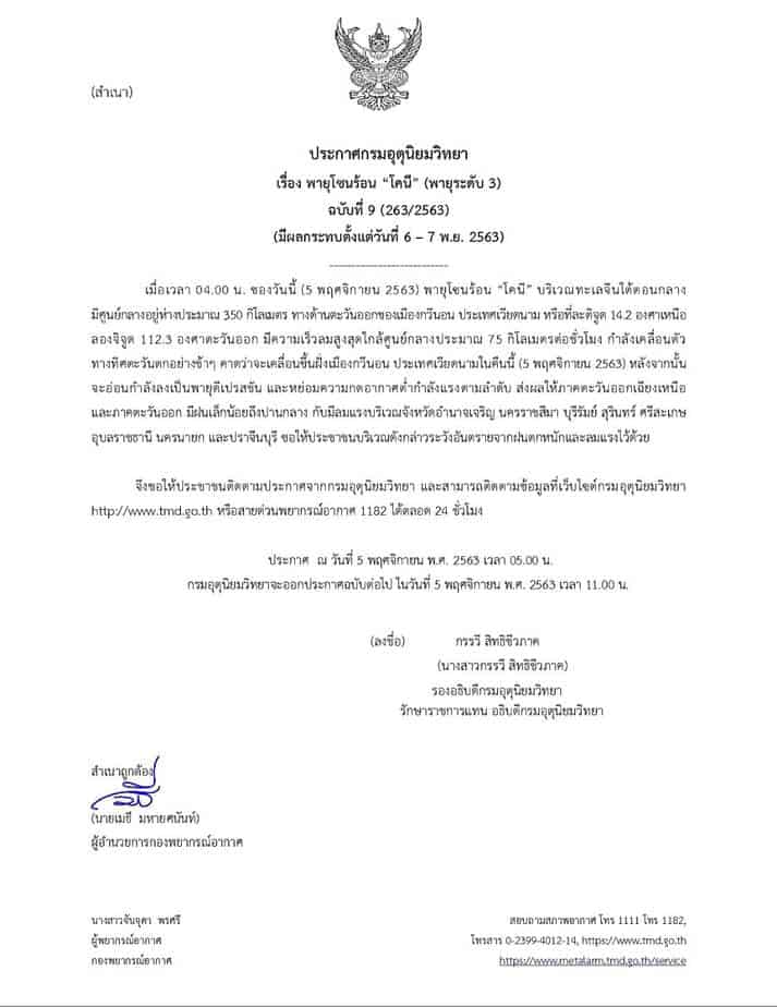 โดยประกาศกรมอุตุนิยมวิทยา เรื่อง พายุโซนร้อน “โคนี่” (พายุระดับ 3) ฉบับที่ 9 (263/2563)ที่จะมีผลกระทบตั้งแต่วันที่ 6 – 7 พ.ย. 2563 ในประกาศมีเนื้อหา คือ เมื่อเวลา 04:00 น. ของวันนี้ (5 พฤศจิกายน 2563) พายุโชนร้อน “โคนี” บริเวณทะเลจีนใต้ตอนกลาง มีศูนย์กลางอยู่ห่างประมาณ 350 กิโลเมตร ทางด้านตะวันออกของเมืองกวีนอน ประเทศเวียดนาม หรือที่ละติจูด 14 2 องศาเหนือ ลองจิจูด 1123 องศาตะวันออก มีความเร็วลมสูงสุดใกล้ศูนย์กลางประมาณ 75 กิโลเมตรต่อชั่วโมง กำลังเคลื่อนตัว ทางทิศตะวันตกอย่างช้าๆ คาดว่าจะเคลื่อนขึ้นฝั่งเมืองกวีนอน ประเทศเวียดนามในคืนนี้ (5 พฤศจิกายน 2563) หลังจากนั้น จะอ่อนกำลังลงเป็นพายุดีเปรสชัน และหย่อมความกดอากาศต่ำกำลังแรงตามลำดับ ส่ผลให้ภาคตะวันออกเฉียงเหนือ และภาคตะวันออก มีฝนเล็กน้อยถึงปานกลาง กับมีลมแรงบริเวณจังหวัดอำนาจเจริญ นครราชสีมา บุรีรัมย์ สุรินทร์ ศรีสะเกษ อุบลราธานี นครนายก และปราจีนบุรี ขอให้ประชาชนบริเวณดังกล่าวระวังอันตรายจากฝนตกหนักและลมแรงไว้ด้วย