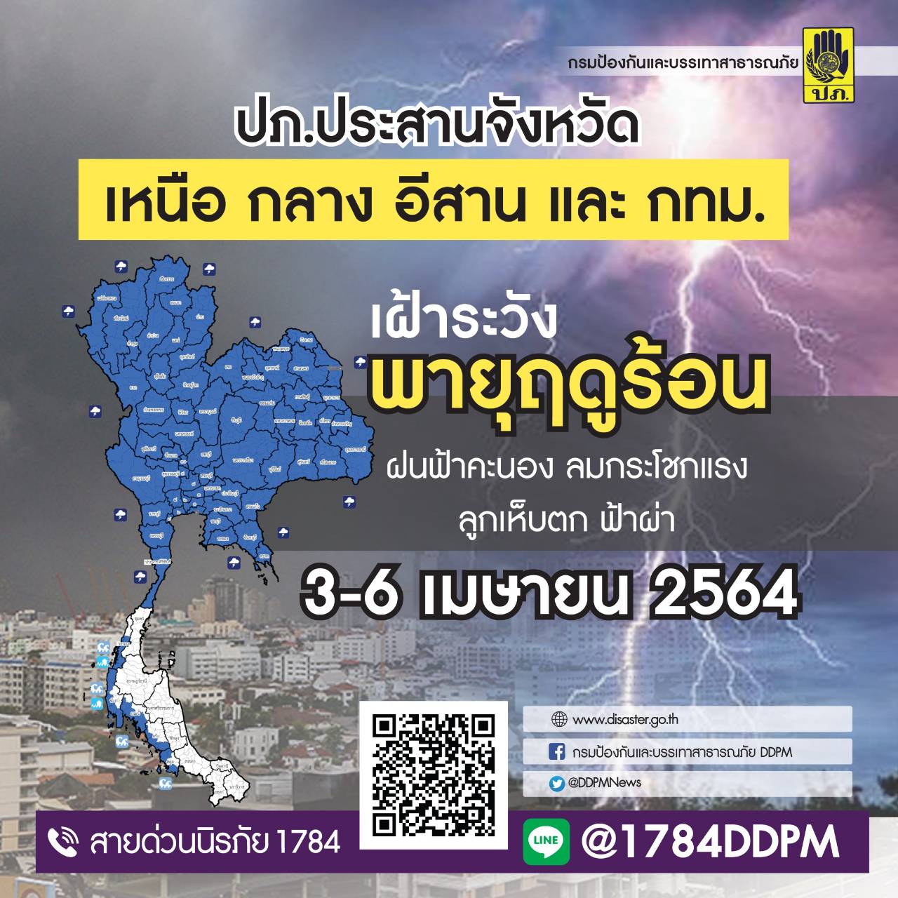 วันที่ 2 เม.ย. 64 เวลา 09.30น. กองอำนวยการป้องกันและบรรเทาสาธารณภัยกลาง (กอปภ.ก) โดยกรมป้องกันและบรรเทาสาธารณภัย (ปภ.) ประสานจังหวัดในพื้นที่ภาคตะวันออกเฉียงเหนือภาคกลาง ภาคเหนือ และกรุงเทพมหานคร เฝ้าระวังและเตรียมพร้อมรับมือพายุฤดูร้อนในช่วงวันที่ 3-6 เม.ย. 64 โดยให้จังหวัดและศูนย์ ปภ. เขตในพื้นที่เสี่ยงภัยติดตามสภาพอากาศและแนวโน้มสถานการณ์ภัยตลอด 24 ชั่วโมง พร้อมระดมสรรพกำลังเจ้าหน้าที่และเครื่องจักรกลสาธารณภัยให้พร้อมปฏิบัติการเผชิญเหตุและช่วยเหลือผู้ประสบภัยทันที อีกทั้งแจ้งเตือนประชาชนติดตามพยากรณ์อากาศ และปฏิบัติตามประกาศเตือนภัยอย่างเคร่งครัด
