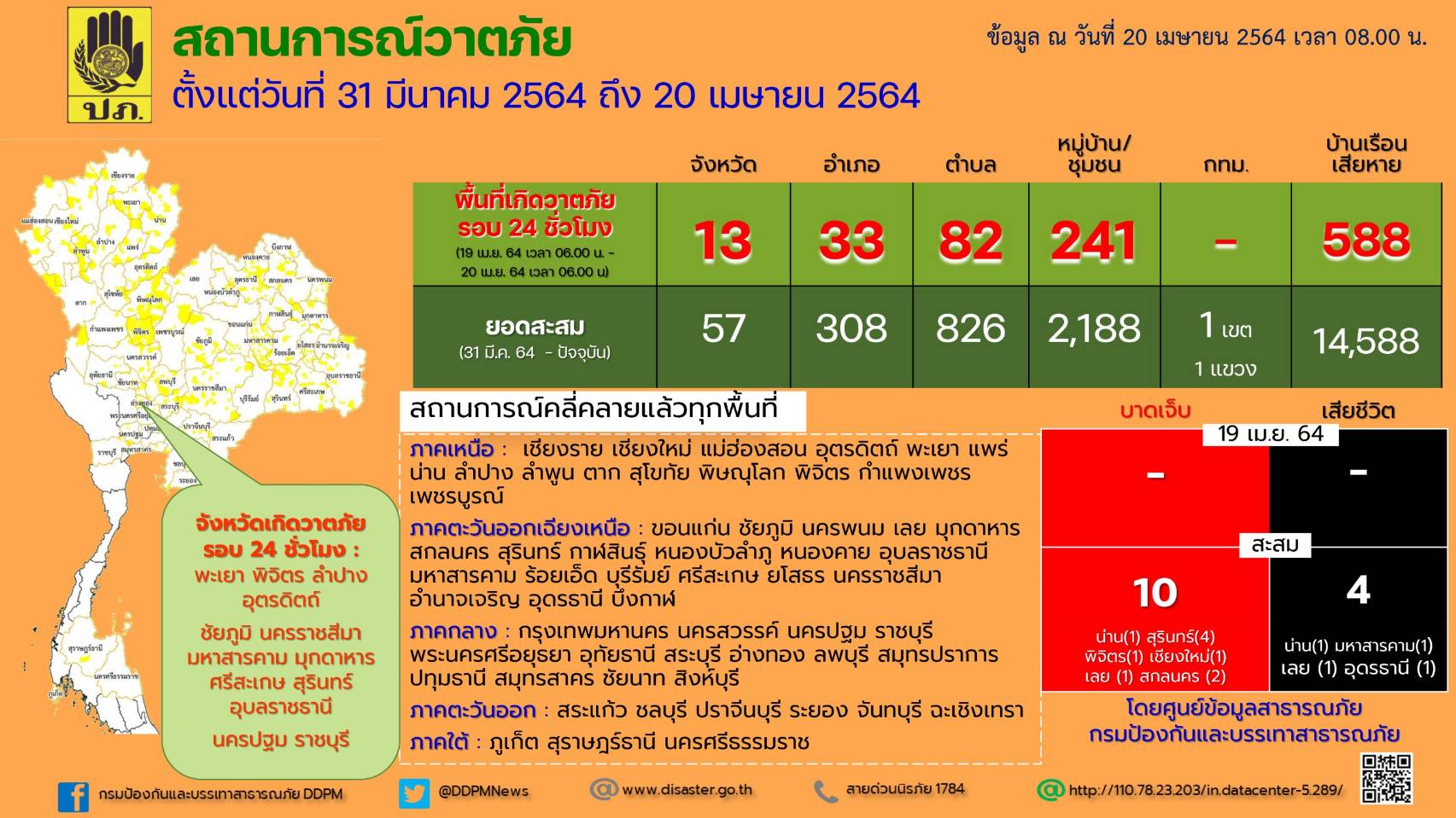 ขณะที่ข้อมูลสถานการณ์ภัยในช่วงตั้งแต่วันที่ 31 มีนาคม 2564 – ปัจจุบัน (20 เมษายน 2564 เวลา 06.00 น.) มีพื้นที่ประสบวาตภัยรวม 57 จังหวัด รวม 308 อำเภอ 826 ตำบล 2,188 หมู่บ้าน 2 เขตเทศบาล บ้านเรือนประชาชนเสียหาย 14,588 หลัง ผู้เสียชีวิต 4 ราย (น่าน มหาสารคาม เลย และอุดรธานี จังหวัดละ 1 ราย) ผู้บาดเจ็บ 10 ราย