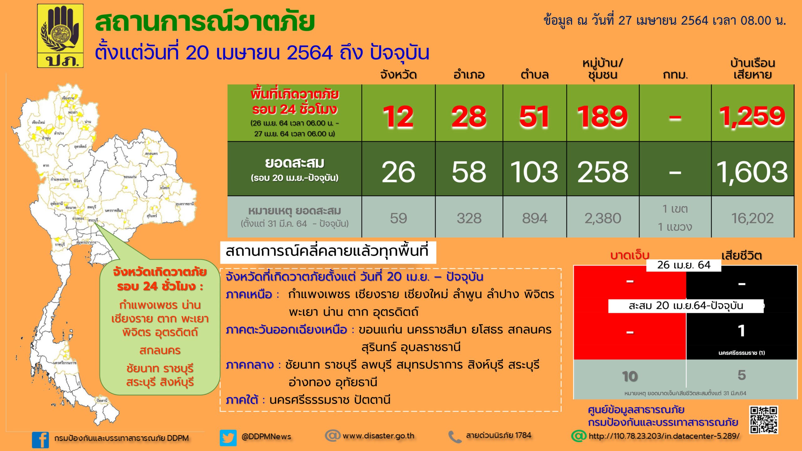 (วันที่ 27 เม.ย. 64 เวลา 06.00 น.) มีพื้นที่ประสบวาตภัย 26 จังหวัด รวม 58 อำเภอ 103 ตำบล 258 หมู่บ้าน บ้านเรือนได้รับความเสียหาย 1,603 หลัง ผู้เสียชีวิต 1 ราย(นครศรีธรรมราช) แยกเป็น