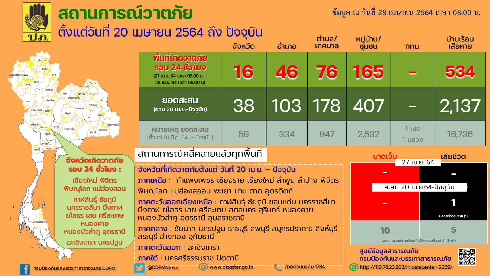 ส่วนตั้งแต่วันที่ 20 เม.ย 64 – ปัจจุบัน (วันที่ 28 เม.ย. 64 เวลา 06.00 น.) มีพื้นที่ประสบวาตภัย 38 จังหวัด รวม 103 อำเภอ 178 ตำบล 407 หมู่บ้าน บ้านเรือนได้รับความ เสียหาย 2,137 หลัง ผู้เสียชีวิต 1 ราย (นครศรีธรรมราช) แยกเป็น