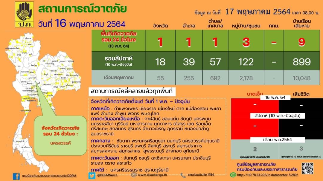 17 พ.ค. 64 เวลา 11.00 น.รายงานในรอบ 24 ชม. ที่ผ่านมาเกิดวาตภัยในพื้นที่จังหวัดนครสวรรค์ รวม 1 อำเภอ 1 ตำบล 3 หมู่บ้าน บ้านเรือนเสียหาย 9 หลัง ส่วนในรอบสัปดาห์ระหว่างวันที่ 10 – 17 พ.ค. 64 เวลา 06.00 น. มีพื้นที่ประสบวาตภัย 18 จังหวัด 39 อำเภอ 57 ตำบล 122 หมู่บ้าน บ้านเรือนเสียหาย 899 หลัง ปัจจุบันสถานการณ์คลี่คลายแล้วทุกจังหวัด ซึ่ง ปภ.ได้ร่วมกับจังหวัดและหน่วยงานที่เกี่ยวข้องลงพื้นที่สำรวจความเสียหายและให้การช่วยเหลือผู้ประสบภัยในเบื้องต้นแล้ว