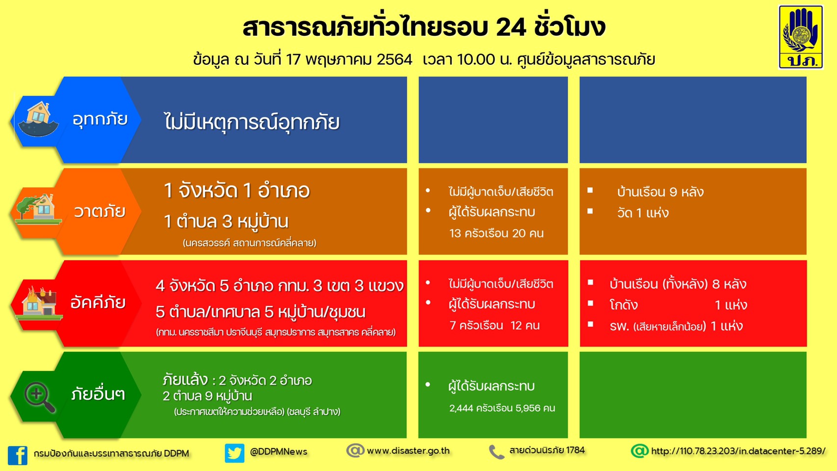 กรมป้องกันและบรรเทาสาธารณภัยในฐานะกองอำนวยการป้องกันและบรรเทาสาธารณภัยกลาง (กอปภ.ก.) รายงานสถานการณ์ลมตะวันตกเฉียงใต้และลมตะวันออกเฉียงใต้ที่พัดปกลุมประเทศไทยตอนบน ทำให้บริเวณประเทศไทยตอนบนมีฝนฟ้าคะนองกับมีลมกระโชกแรง และจากอิทธิพลของลมตะวันออกเฉียงใต้ที่พักปกคลุมอ่าวไทย ภาคใต้ และทะเลอันดามัน ส่งผลให้เกิดฝนฟ้าคะนอง และฝนตกหนัก โดยในรอบ 24 ชั่วโมงที่ผ่านมาเกิดวาตภัย 1 จังหวัด ได้แก่ นครสวรค์ในพื้นที่ตำบลหนองหลวง อำเภอท่าตะโก บ้านเรือนเสียหาย 9 หลัง ขณะที่ในระหว่างวันที่ 10 – 17 พ.ค. 64 เวลา 06.00 น. มีพื้นที่ประสบวาตภัย 18 จังหวัด 39 อำเภอ 57 ตำบล 122 หมู่บ้าน บ้านเรือนเสียหาย 899 หลัง ส่วนตั้งแต่วันที่ 1 พ.ค. 64 – ปัจจุบัน มีพื้นที่ประสบวาตภัย 55 จังหวัด 255 อำเภอ 692 ตำบล 2,178 หมู่บ้าน บ้านเรือนเสียหาย 10,048 หลัง ผู้เสียชีวิต 3 ราย (สุราษฎร์ธานี ลพบุรี และนครราชสีมา จังหวัดละ 1 ราย) ผู้บาดเจ็บ 2 ราย (สุราษฎร์ธานีและนครราชสีมา จังหวัดละ 1 ราย) แยกเป็น