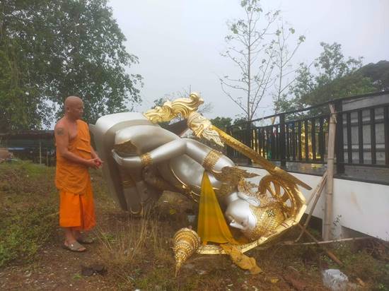 ทางพระครูวีรธรรมาภิวัฒน์ เจ้าอาวาสวัดปางเฟือง เจริญพรว่า องค์พระพุทธรูปที่ล้มจากแรงพายุฝนเมื่อคืนที่ผ่านมา ชื่อว่าพระมหาจักรพรรดิ์ทรงเครื่อง เนื้อทองเหลืองมีขนาดหน้าตักกว้าง 2 เมตร สูง 3 เมตร มีน้ำหนัก หลายตัน สร้างเมื่อปีพ.ศ.2564 ประดิษฐานบนพื้นที่โล่งแจ้ง ใต้ฐานองค์พระปูพื้นด้วยหินแกรนิต มีซุ้มเรือนแก้วครอบ