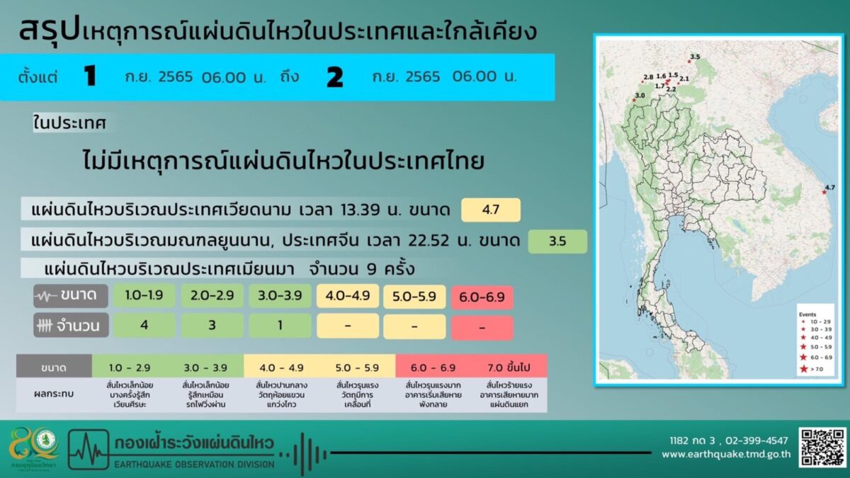 สำหรับสถานการณ์แผ่นดินไหวในช่วงวันที่ 1-2 กันยายน 2565 ตรวจพบเหตุการณ์แผ่นดินไหว ขนาด 2.8, 3.0, 1.6, 2.1, 1.9, 2.2, 1.5 และ 1.7 มีศูนย์กลางอยู่ที่ประเทศเมียนมา ขนาด 4.7 มีศูนย์กลางอยู่ที่ประเทศเวียดนาม และ ขนาด 3.5 มีศูนย์กลางอยู่ที่มณฑลยูนนาน, ประเทศจีนไม่มีผลกระทบต่อประเทศไทยแต่อย่างใด