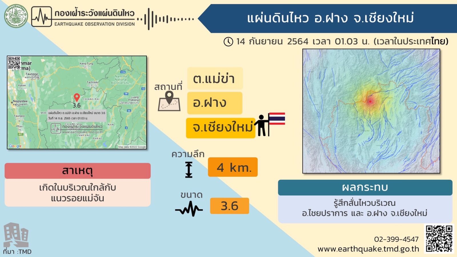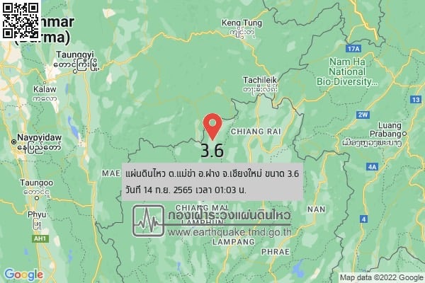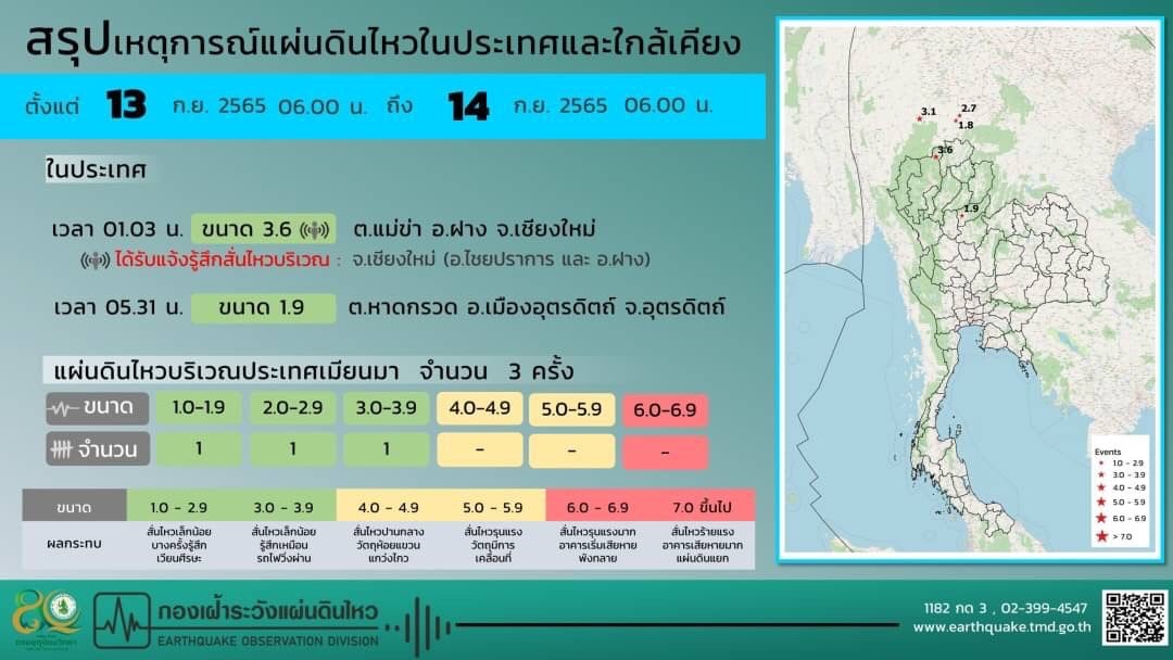 สำหรับสถานการณ์แผ่นดินไหว ในช่วงวันที่ 13-14 กันยายน 2565 ตรวจพบเหตุการณ์แผ่นดินไหว ขนาด 1.8-3.1 จำนวน 3 ครั้ง มีศูนย์กลางอยู่ที่ประเทศเมียนมา ขนาด 3.6 มีศูนย์กลางอยู่ที่ ต.แม่ข่า อ.ฝาง จ.เชียงใหม่ ได้รับแจ้งรู้สึกสั่นไหวบริเวณ อ.ไชยปราการ และ อ.ฝาง และขนาด 1.9 มีศูนย์กลางอยู่ที่ ต.หาดกรวด อ.เมือง จ.อุตรดิตถ์