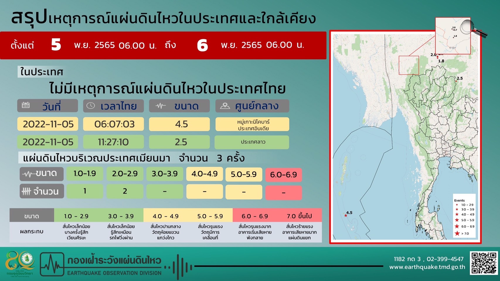 สำหรับสถานการณ์แผ่นดินไหวในช่วงวันที่ 5-6 พฤศจิกายน 2565 ตรวจพบเหตุการณ์แผ่นดินไหว ขนาด 4.5 มีศูนย์กลางอยู่ที่หมู่เกาะนิโคบาร์ ประเทศอินเดีย ขนาด 2.5 มีศูนย์กลางอยู่ที่ประเทศลาว ขนาด 2.7, 1.8 และ 2.0 มีศูนย์กลางอยู่ที่ประเทศเมียนมา ซึ่งเป็นแผ่นดินไหวขนาดเล็ก ไม่มีผลกระทบต่อประเทศไทยแต่อย่างใด