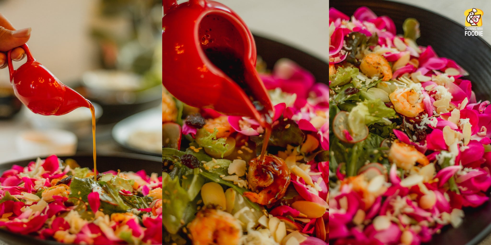 เริ่มต้นด้วย Rose Salad กลีบกุหลาบสดออร์แกนิคที่ทางร้านปลูกเอง เสิร์ฟพร้อมกับน้ำสลัดอิตาเลี่ยนเดรสซิ่ง คลุกเคล้ากัน