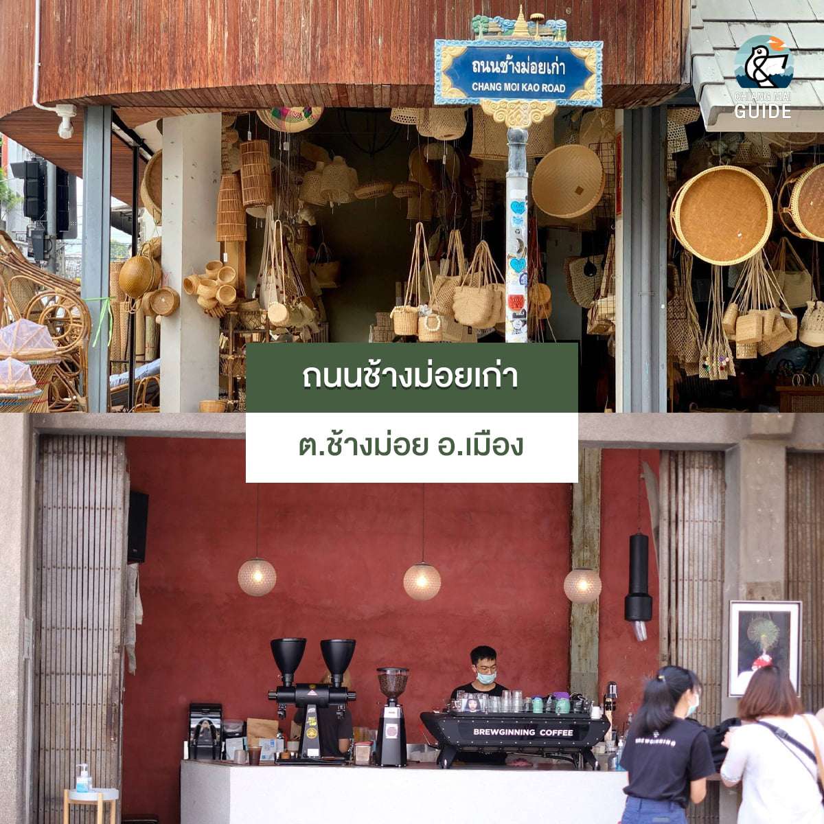 ถ่ายรูปที่ท่าแพจนจุใจก็ไปกันที่ย่านถนนช้างม่อยเก่า อีกหนึ่งย่านชุมชนยอดฮิต กับการถ่ายรูปกับร้านหวายน้ำผึ้ง ซึ่งเป็นร้านขายของจักสาน ทั้งกระเป๋า และของใช้ต่าง ๆ ข้างกันก็เป็นร้านกาแฟชื่อดังอย่างร้าน Brewginning ถูกใจสาย cafe hopping สุด ๆ