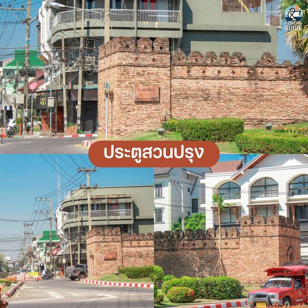 3. ประตูสวนปรุง ประตูสวนปรุง เดิมชื่อประตูแสนปรุง ตั้งอยู่ทิศตะวันตกเฉียงใต้ เป็นประตูที่เจาะกำแพงชั้นในด้านใต้สร้างขึ้นใหม่ในรัชสมัย พญาสามฝั่งแกน เนื่องจากในรัชสมัยของพระองค์ได้สร้างเจดีย์ราชกุฏคาร (เจดีย์หลวง) ขึ้น ดังนั้น เพื่อความสะดวกแก่พระราชชนนี ที่โปรดประทับอยู่ที่ตำหนักสวนแร (ทิพย์เนตร) นอกกำแพงเมืองด้านทิศใต้ จะได้ทรงสะดวกในการเสด็จมาสักการะพระเจดีย์ จึงโปรดให้เจาะกำแพงเมืองด้านนั้น และตั้งชื่อว่า ประตูสวนแร ต่อมาเนื่องจากบริเวณนั้นเป็นที่ใช้ประหารนักโทษ ใช้หอกหลาวทิ่มแทงปุง (พุง) ชาวบ้านจึงเรียกว่าประตูสวนปุง หรือ ประตูแสนปุง นับแต่อดีต เชียงใหม่มีประเพณีที่ว่าหากมีการเสียชีวิตภายในเขตกำแพงเมืองเชียงใหม่ จะต้องนำศพออกจากตัวเมืองผ่านทางประตูนี้เท่านั้น ซึ่งก็ยังยึดถือประเพณีนี้อยู่จนถึงปัจจุบัน