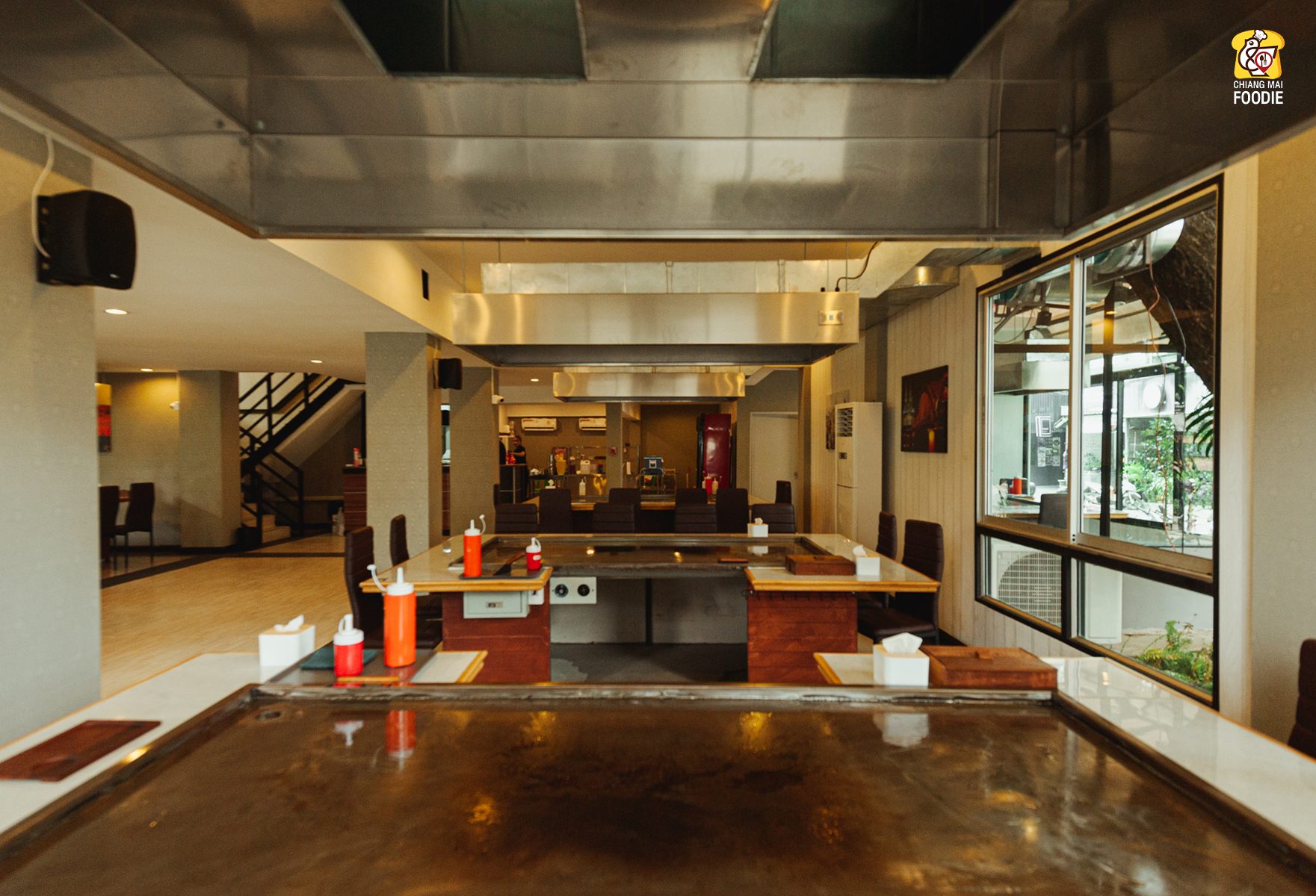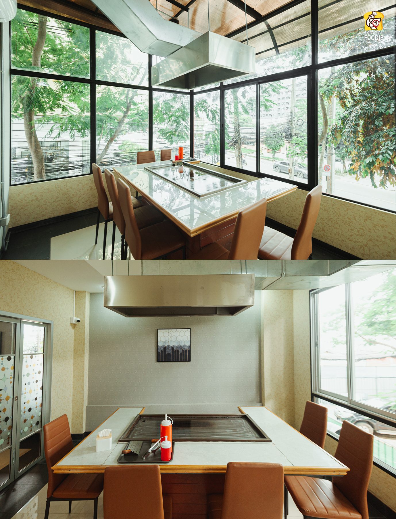 สำหรับชั้นล่างเป็นแบบห้องกว้างใหญ่โล่งๆ มี 6 โต๊ะ เลือกนั่งได้เลย พวกกริลๆ ย่างๆ ผัดๆ บนกระทะเทปันใหญ่มว้ากกกก ชั้นสอง เป็นห้องแบบไพรเวทส่วนตัว มีตั้งแต่ 3-7 ที่นั่ง อยากได้แบบไหน ก็บอกทีมงานได้เลยค่ะ ไม่มีคิดค่าใช้จ่ายเพิ่ม เพียงแค่จองล่วงหน้าเท่านั้น