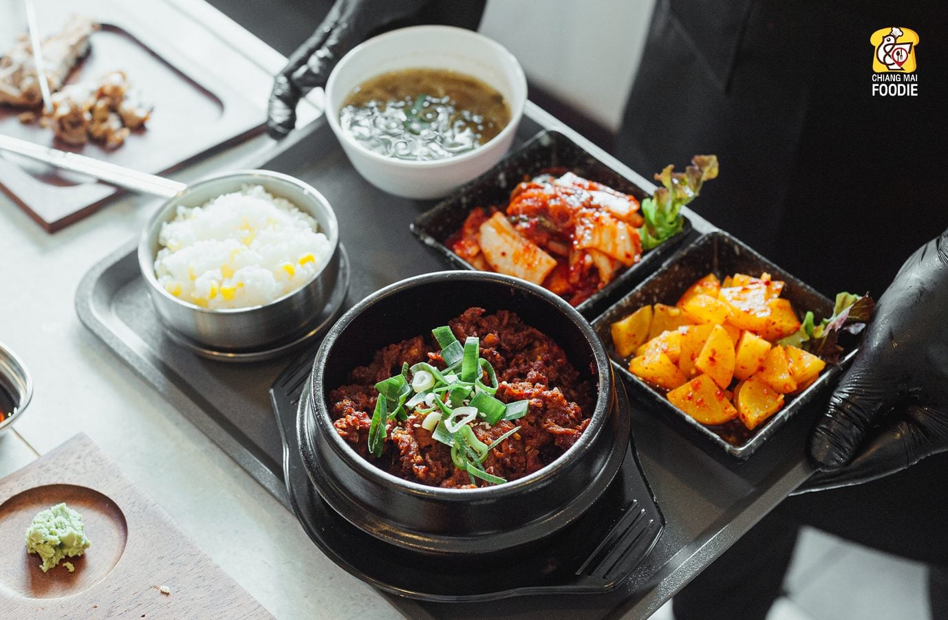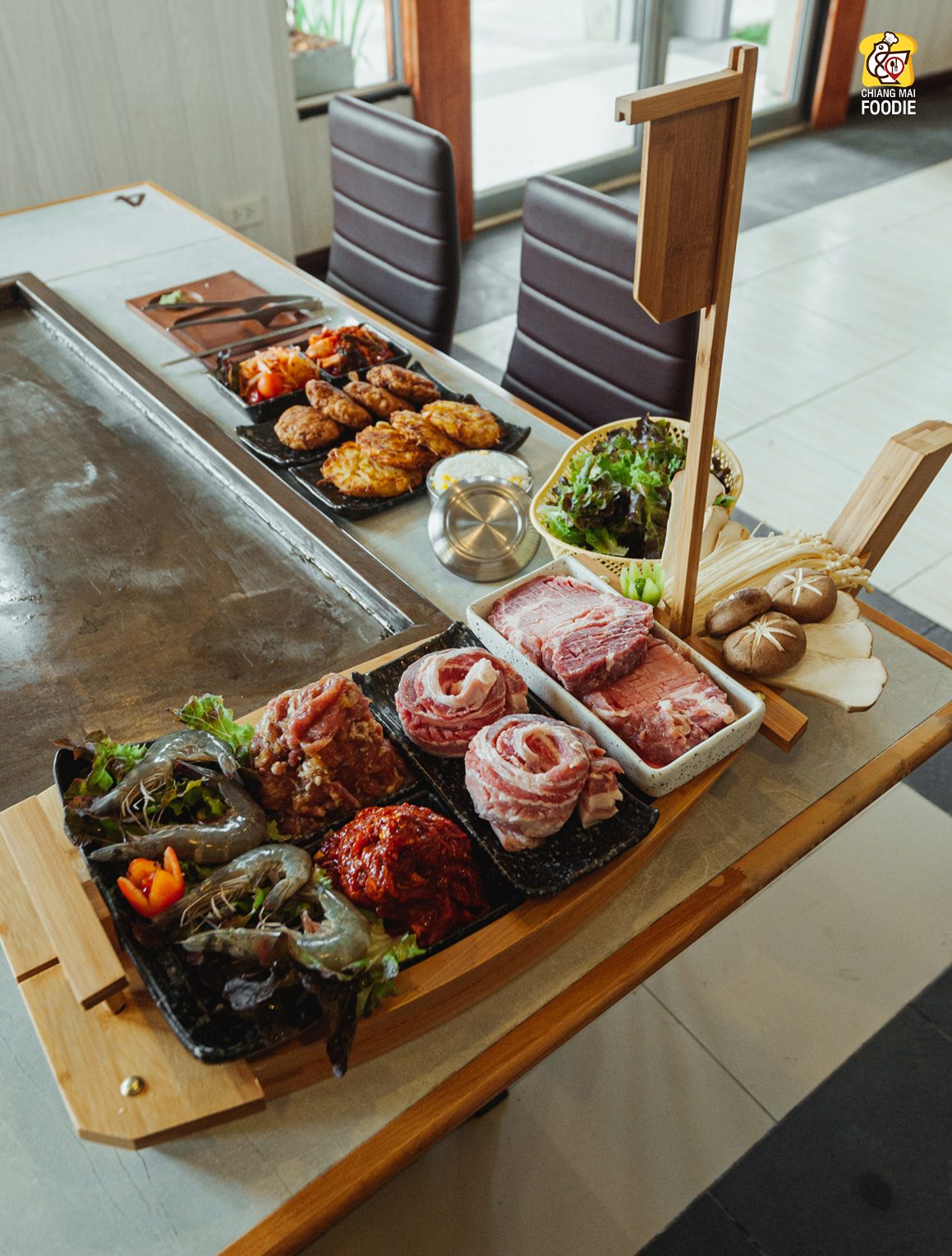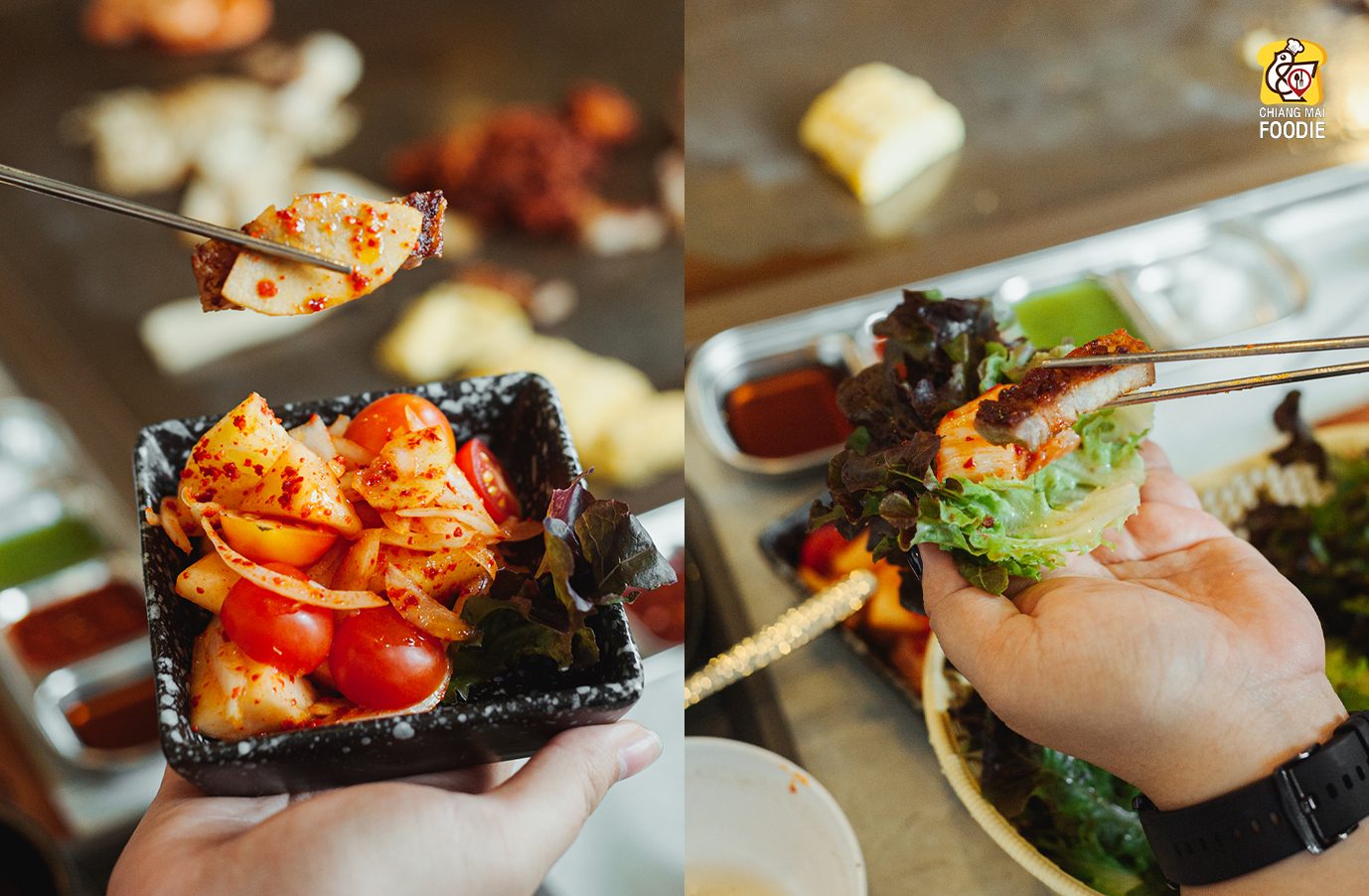 แต่ละเซท ก็จะได้รับ ผักสด กิมจิ คัมจาจอน วันจา ข้าวหุงกับข้าวโพด สลัดผลไม้ พร้อมกับ เครื่องจิ้ม 4 แบบ คันจัง โคชูจัง โซกึม(เกลือทะเล) แถมท้ายน้ำจิ้มสามรส