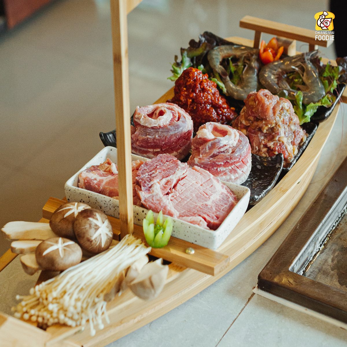 เสิร์ฟแรกจัดมาสวยๆ บนเรือ ด้านในเป็นหมูสามชั้น หมูสไลด์ หมูหมักซอส กุ้ง และผักสด จัดเต็มแบบแน่นๆ ถ้ายังไม่อิ่ม ก็บอกเลือกเนื้อหมูเลือกกุ้งเพิ่มได้เลย