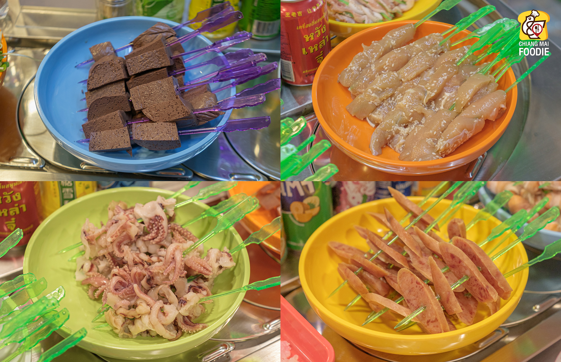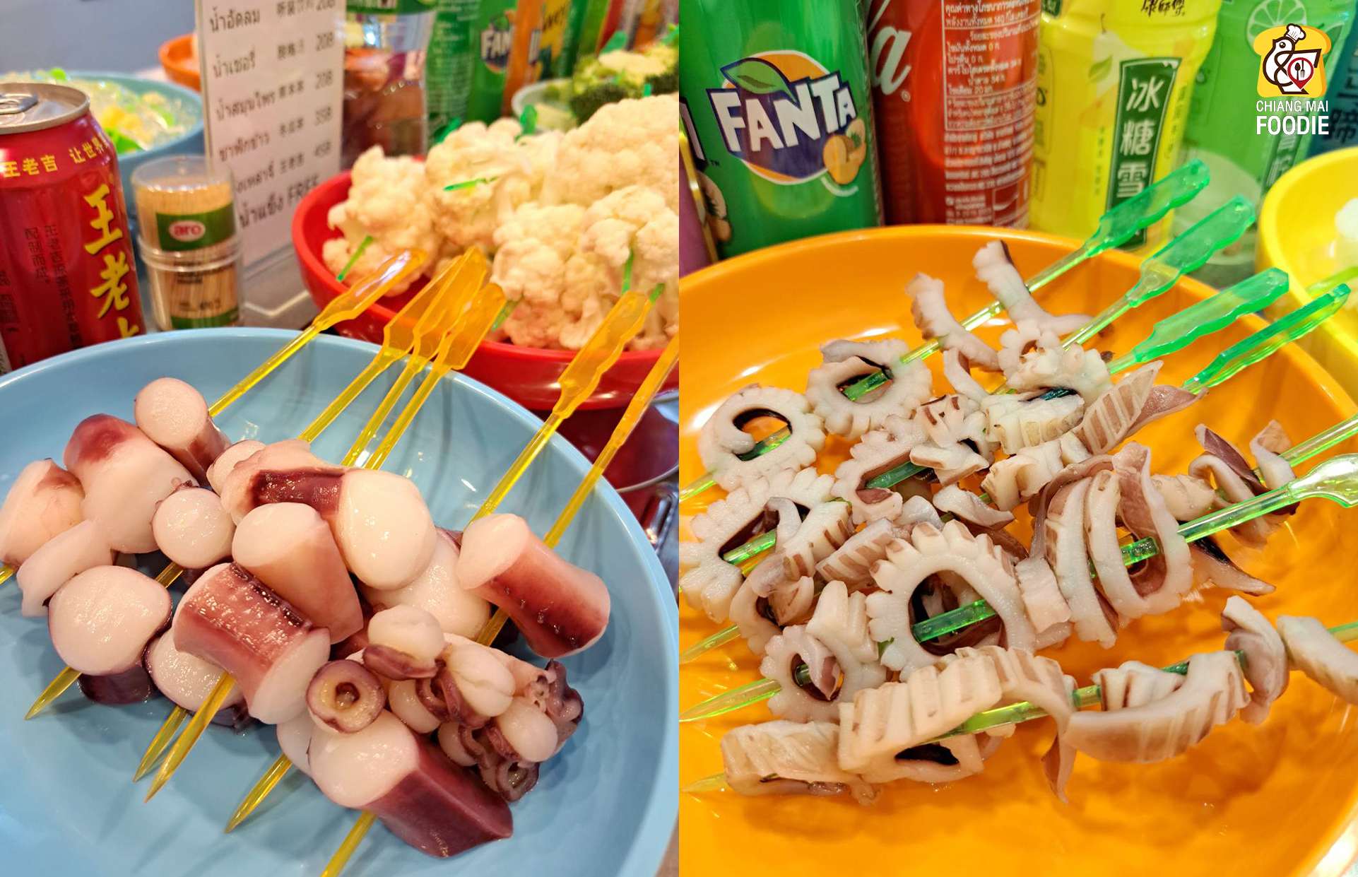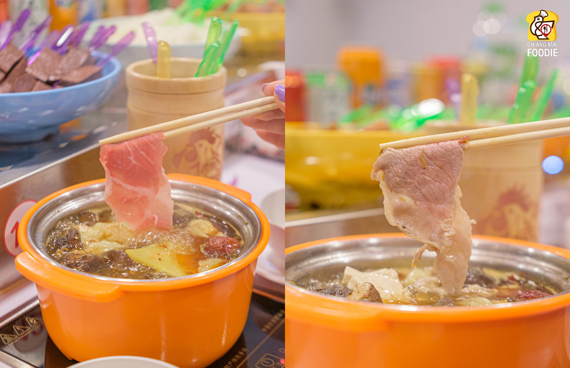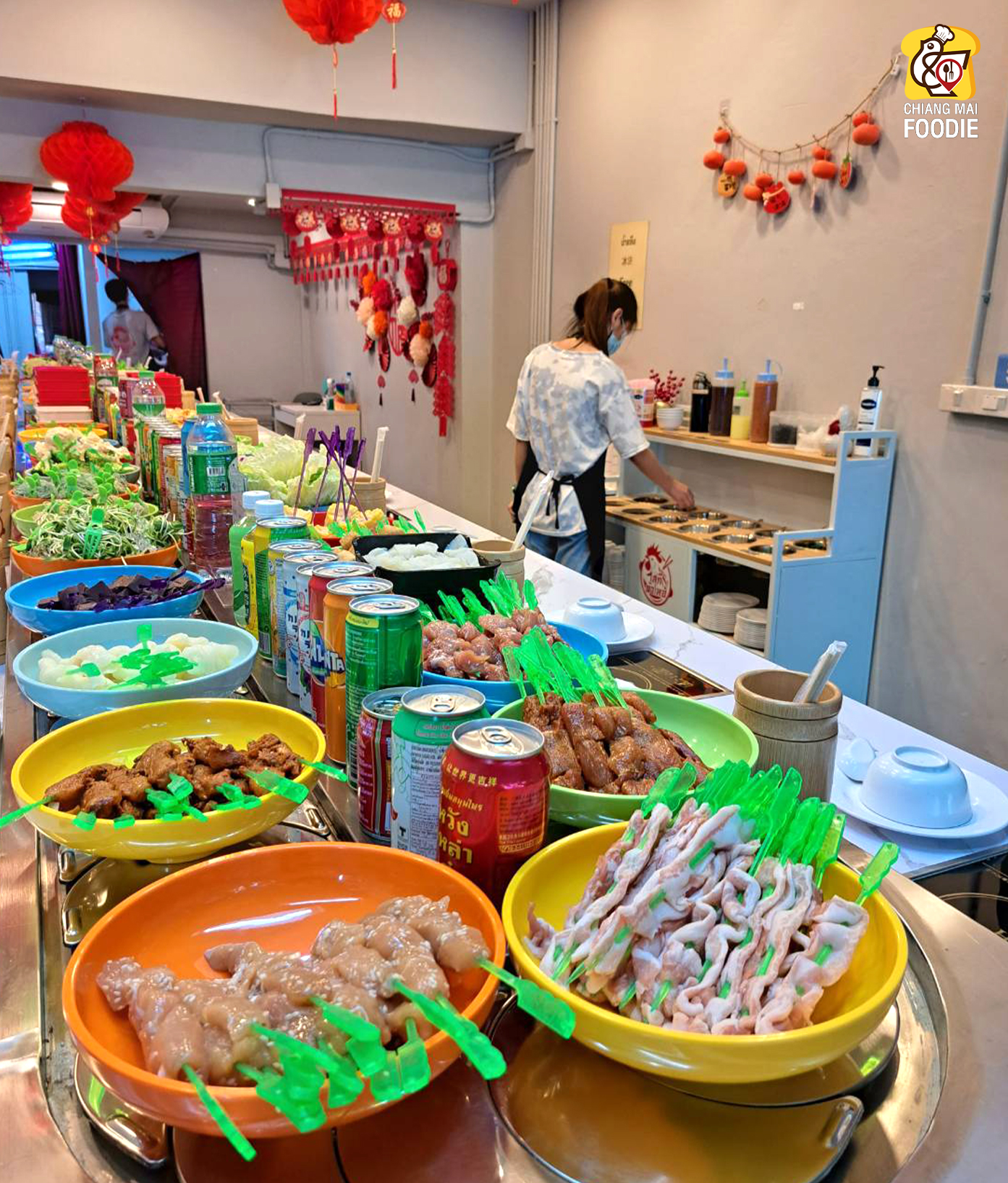 ร้านสุกี้จีน อยู่ตรงย่านหลัง มช. นี่เอง เปิดช่วง 4 โมงเย็น ถึงสี่ทุ่มครึ่ง อยู่ใกล้ๆ กับเชียงใหม่ไดเรคนะ จอดรถได้ทั้งตรงหน้าร้านและฝั่งตรงข้าม มีของให้เลือกเยอะมากกว่า 60 อย่าง ทั้งหมู ไก่ หมึก (บะมีเนื้อเน้อสูเขา) ลูกชิ้น ไส้กรอก สารพัดเห็ด สาหร่าย กวางตุ้ง ผักกาด ผักบุ้ง เส้นมัน เส้นมันม่วง เย๊อะ มาเลือกเอง บอกเลอออ ว่าสามชั้นเสียบไม้ ไก่หม่าล่า กับไส้เป็ดคือดีย์ โหวต1 เชียร์ 1 เลือกหยิบกันตามสไตล์ ม่วง 5 เขียว 10 เหลือง 20 ถาด 30 สมราคา โปรโมชั่น น้ำจิ้มก็คิดราคาคนละ 9 บาท เติมได้ไม่อั้นปรุงได้ไม่อั้น แต่ถ้าไม่มั่นใจก็..มีสูตรของทางร้านปรุงไว้ให้หยิบได้เลย น้ำจิ้ม ซอสงา นำเข้าจากจีน