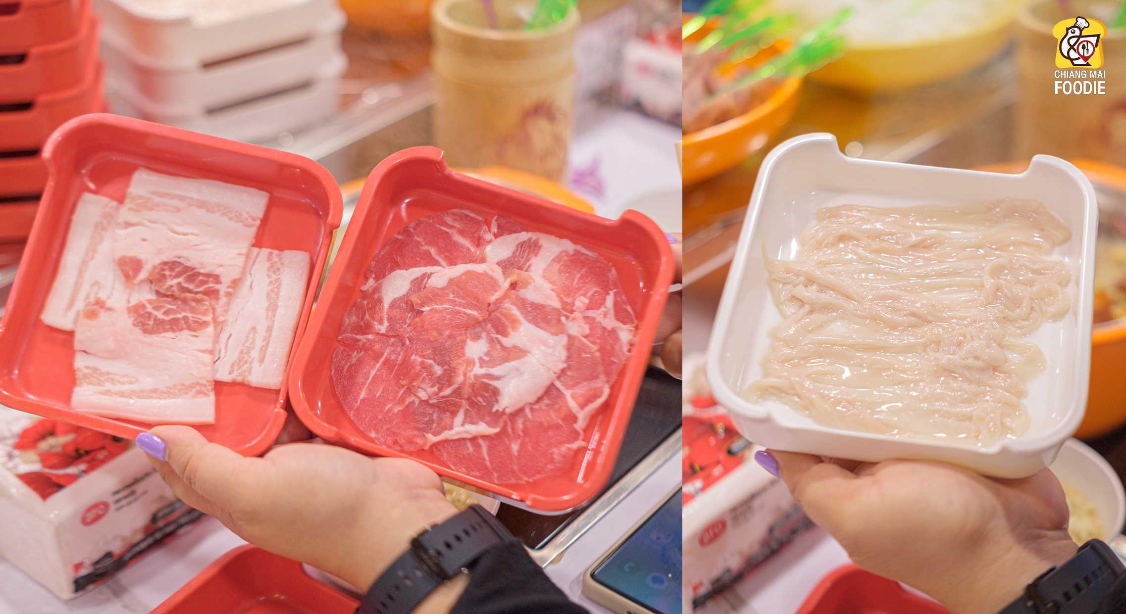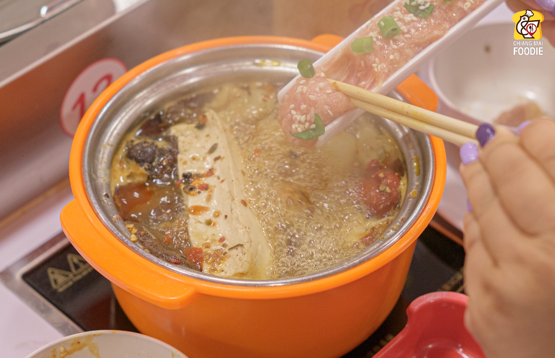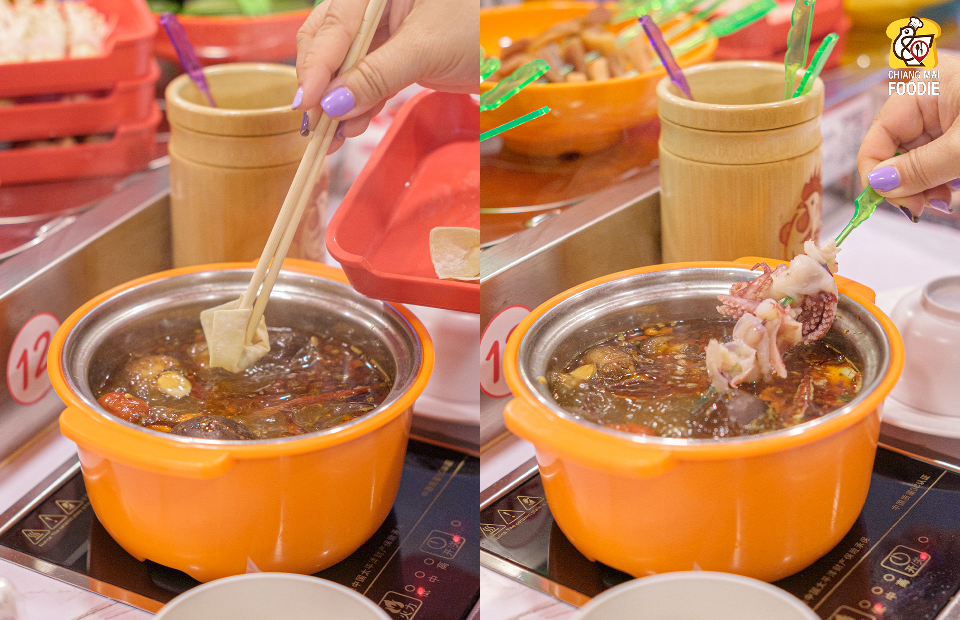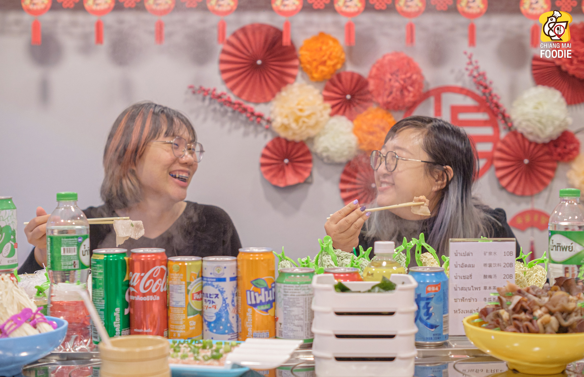 ร้านสุกี้จีน อยู่ตรงย่านหลัง มช. นี่เอง เปิดช่วง 4 โมงเย็น ถึงสี่ทุ่มครึ่ง อยู่ใกล้ๆ กับเชียงใหม่ไดเรคนะ จอดรถได้ทั้งตรงหน้าร้านและฝั่งตรงข้าม มีของให้เลือกเยอะมากกว่า 60 อย่าง ทั้งหมู ไก่ หมึก (บะมีเนื้อเน้อสูเขา) ลูกชิ้น ไส้กรอก สารพัดเห็ด สาหร่าย กวางตุ้ง ผักกาด ผักบุ้ง เส้นมัน เส้นมันม่วง เย๊อะ มาเลือกเอง บอกเลอออ ว่าสามชั้นเสียบไม้ ไก่หม่าล่า กับไส้เป็ดคือดีย์ โหวต1 เชียร์ 1 เลือกหยิบกันตามสไตล์ ม่วง 5 เขียว 10 เหลือง 20 ถาด 30 สมราคา โปรโมชั่น น้ำจิ้มก็คิดราคาคนละ 9 บาท เติมได้ไม่อั้นปรุงได้ไม่อั้น แต่ถ้าไม่มั่นใจก็..มีสูตรของทางร้านปรุงไว้ให้หยิบได้เลย น้ำจิ้ม ซอสงา นำเข้าจากจีน