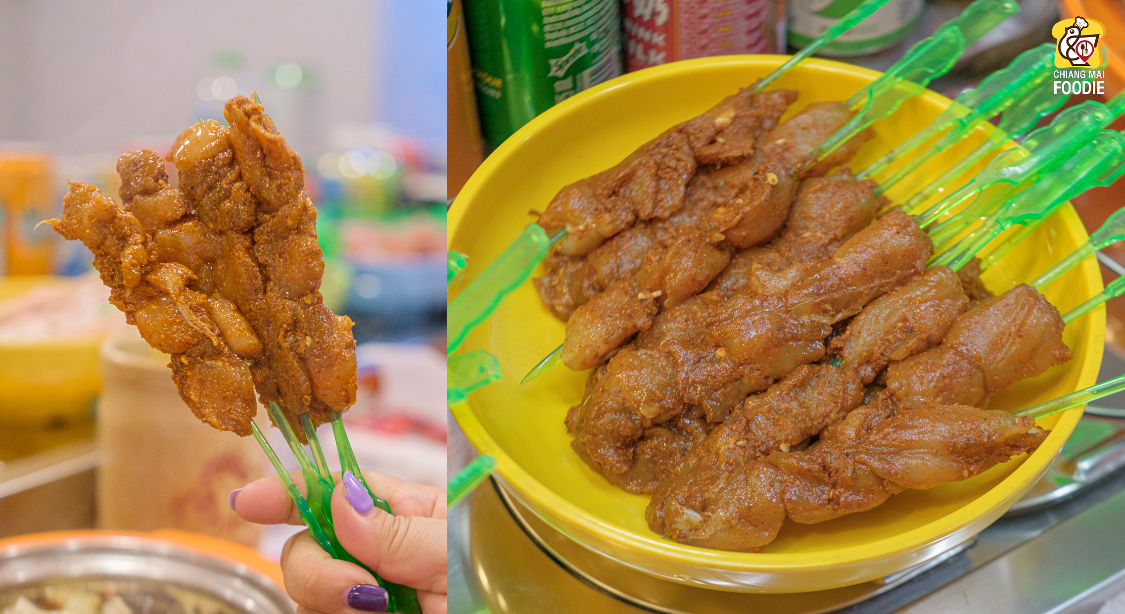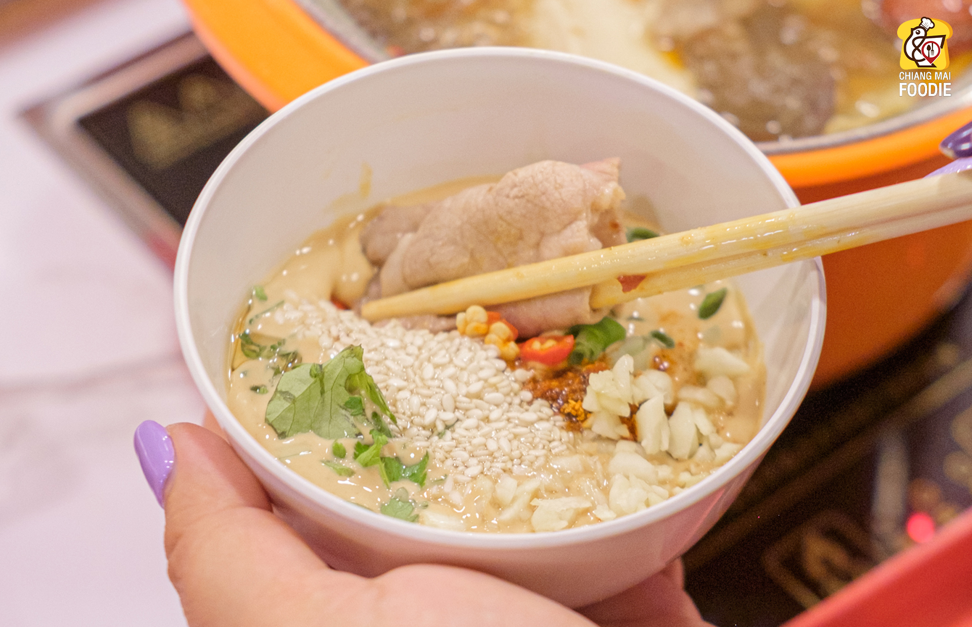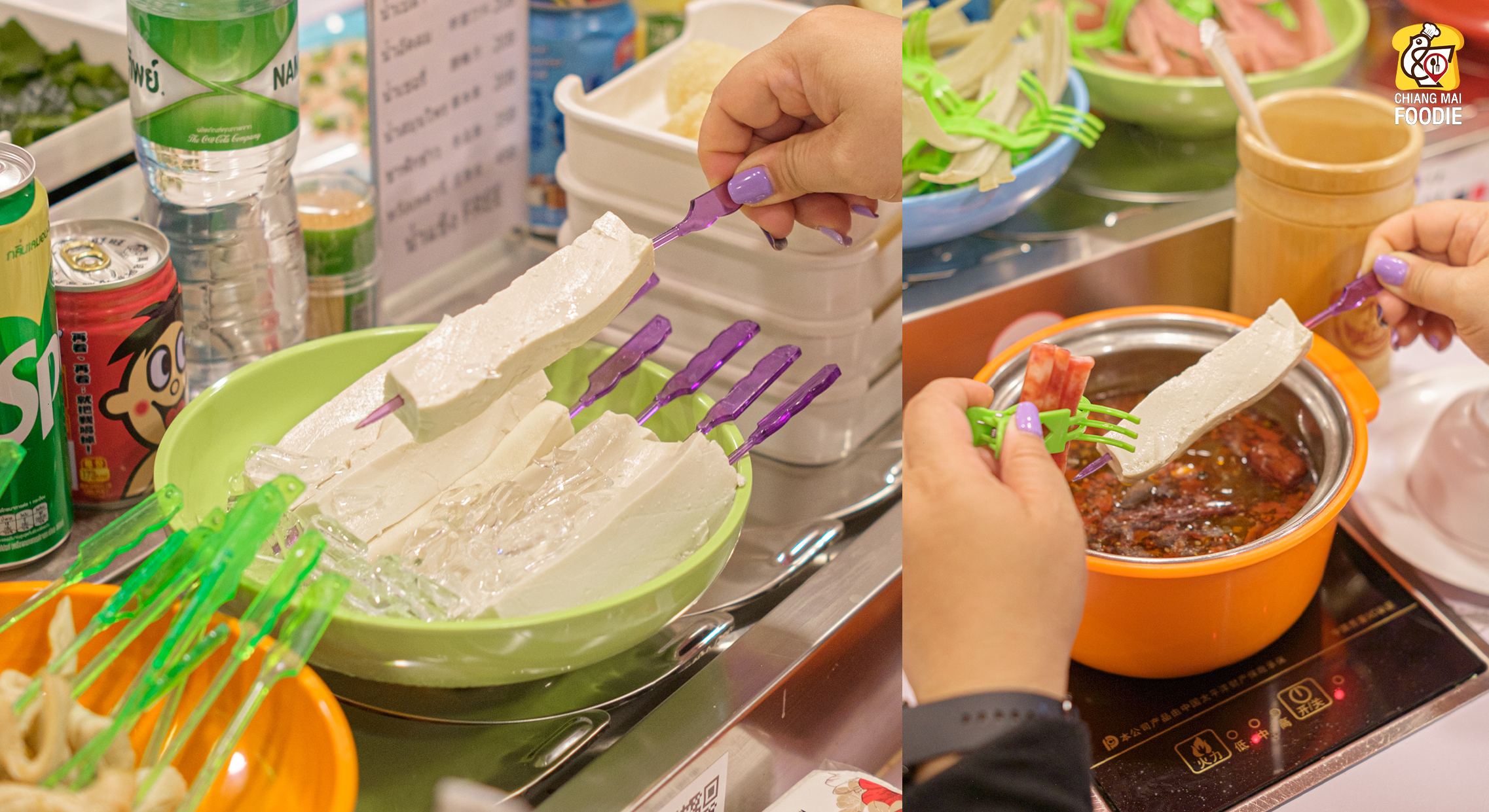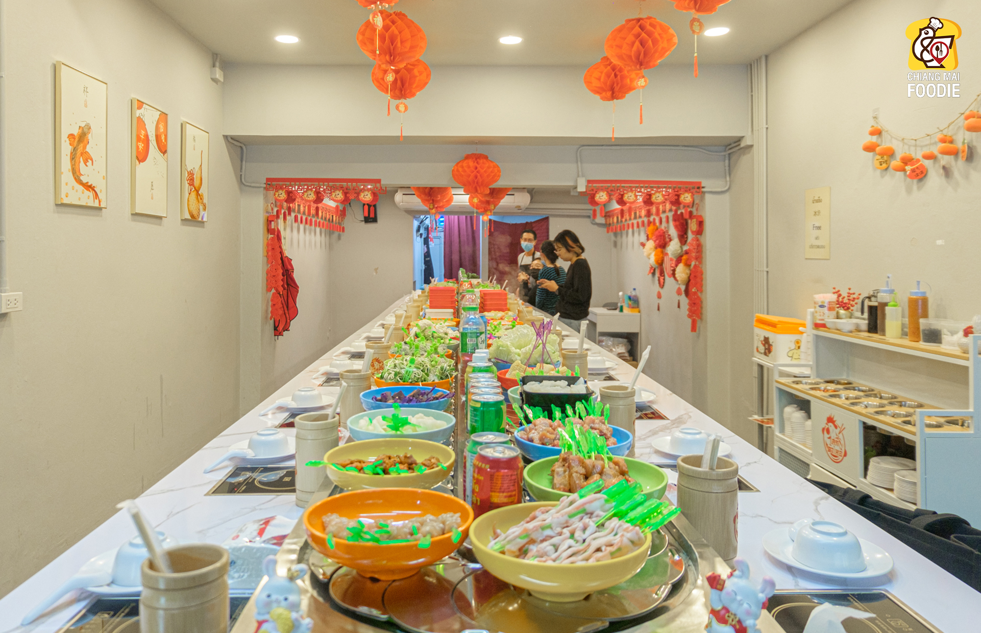 ร้านสุกี้จีน อยู่ตรงย่านหลัง มช. นี่เอง เปิดช่วง 4 โมงเย็น ถึงสี่ทุ่มครึ่ง อยู่ใกล้ๆ กับเชียงใหม่ไดเรคนะ จอดรถได้ทั้งตรงหน้าร้านและฝั่งตรงข้าม มีของให้เลือกเยอะมากกว่า 60 อย่าง ทั้งหมู ไก่ หมึก (บะมีเนื้อเน้อสูเขา) ลูกชิ้น ไส้กรอก สารพัดเห็ด สาหร่าย กวางตุ้ง ผักกาด ผักบุ้ง เส้นมัน เส้นมันม่วง เย๊อะ มาเลือกเอง บอกเลอออ ว่าสามชั้นเสียบไม้ ไก่หม่าล่า กับไส้เป็ดคือดีย์ โหวต1 เชียร์ 1 เลือกหยิบกันตามสไตล์ ม่วง 5 เขียว 10 เหลือง 20 ถาด 30 สมราคา โปรโมชั่น น้ำจิ้มก็คิดราคาคนละ 9 บาท เติมได้ไม่อั้นปรุงได้ไม่อั้น แต่ถ้าไม่มั่นใจก็..มีสูตรของทางร้านปรุงไว้ให้หยิบได้เลย น้ำจิ้ม ซอสงา นำเข้าจากจีน