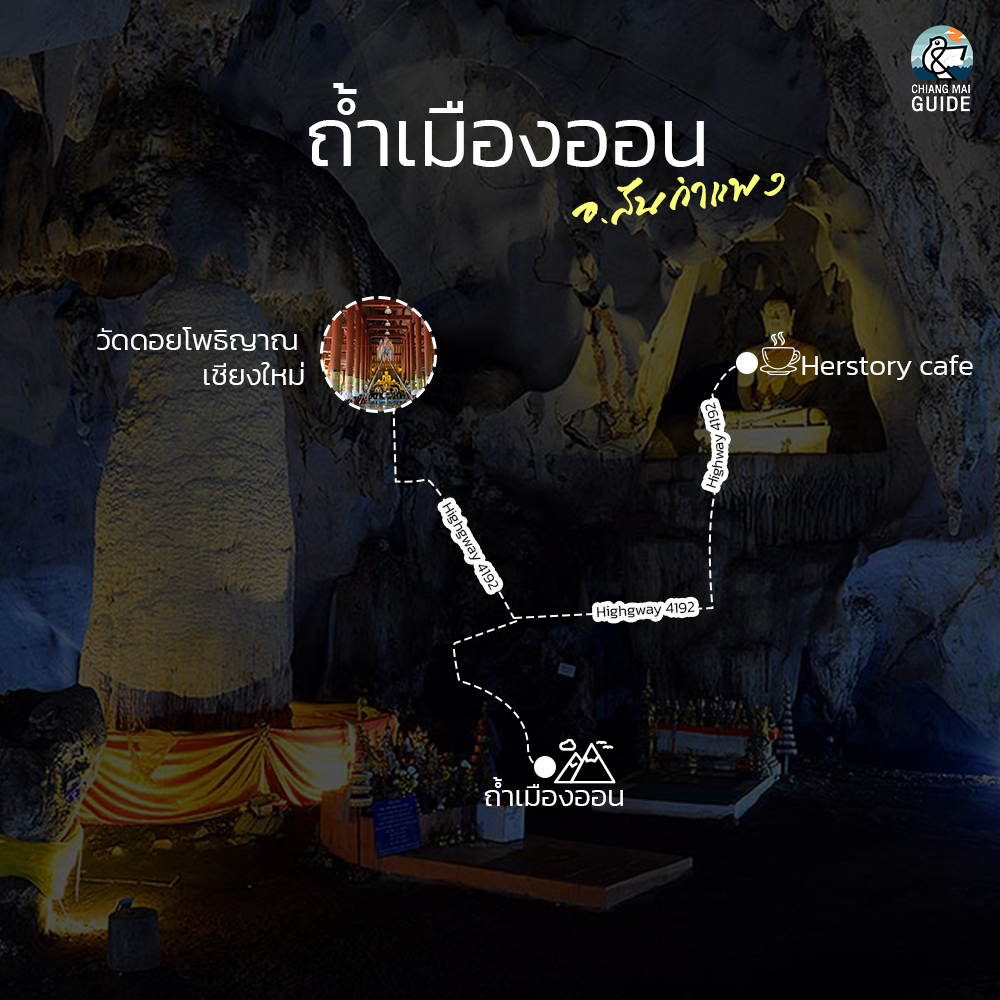 โดยรถยนต์ – จากตัวเมืองเชียงใหม่ใช้ทางหมายเลข 1006 (เชียงใหม่ – สันกำแพง) จากนั้นไปจนสุดระยะทางจะพบทางแยกตัดผ่านเส้นทางหมายเลข 1317 เข้าสู่อำเภอสันกำแพง เลี้ยวซ้ายไปตามเส้นทางหมาเลข 1317 เป็นระยะทางอีกประมาณ 7 สังเกตบ้านถ้ำเมืองออนทางด้านซ้ายมือ จากนั้นเลี้ยวซ่ายเข้าไปอีกประมาณ 1 กิโลเมตร