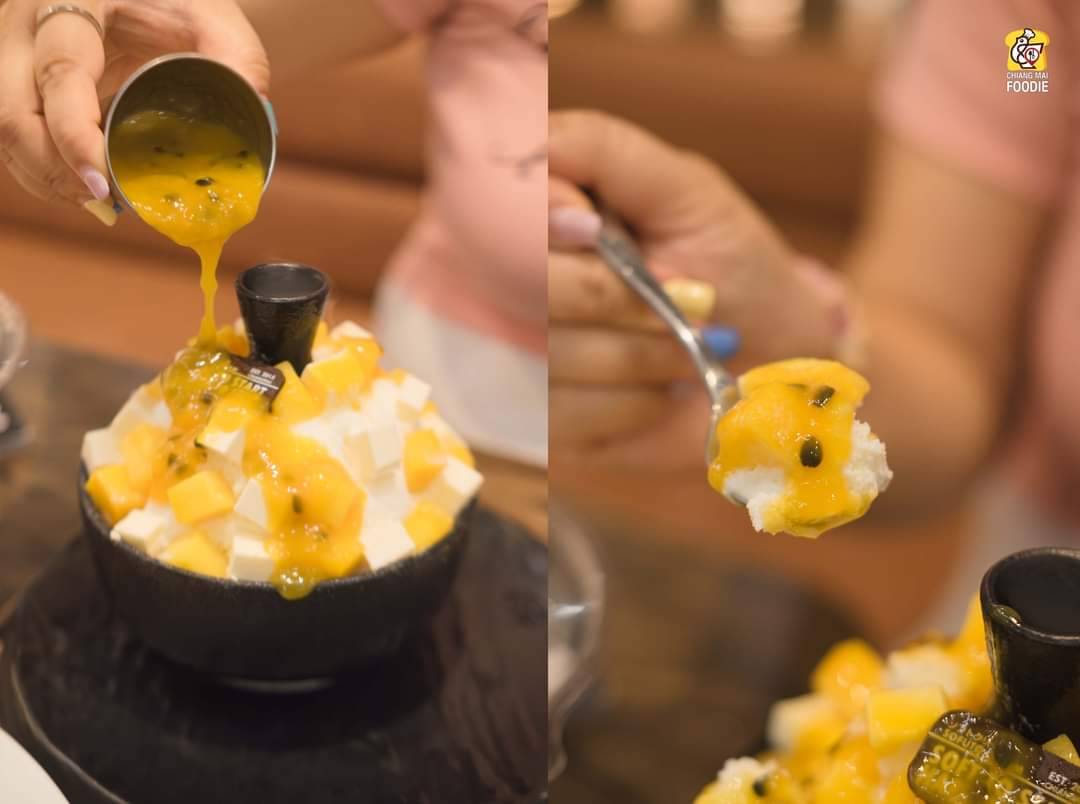 น้ำแข็งนมเกล็ดหิมะภูเขาไฟ นุ่มๆเบาๆแบบฉบับญี่ปุ่น ราดด้วยน้ำซอสมะม่วงและเสาวรส ที่ทำจากผลไม้แท้สดๆ ทานคู่กับ Hokkaido Cheesecake รสละมุน และมะม่วงน้ำน้ำดอกไม้เกรด A บอกเลยว่าลงตัวเข้ากันแบบสุดๆ สัมผัสได้ถึงความละมุนและความสดชื่นตั้งแต่คำแรก