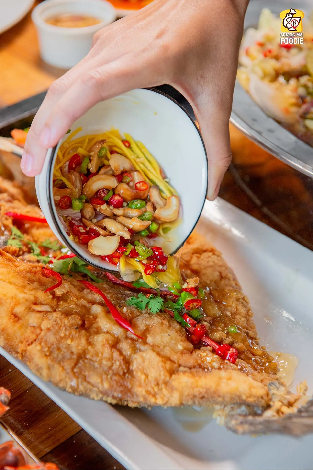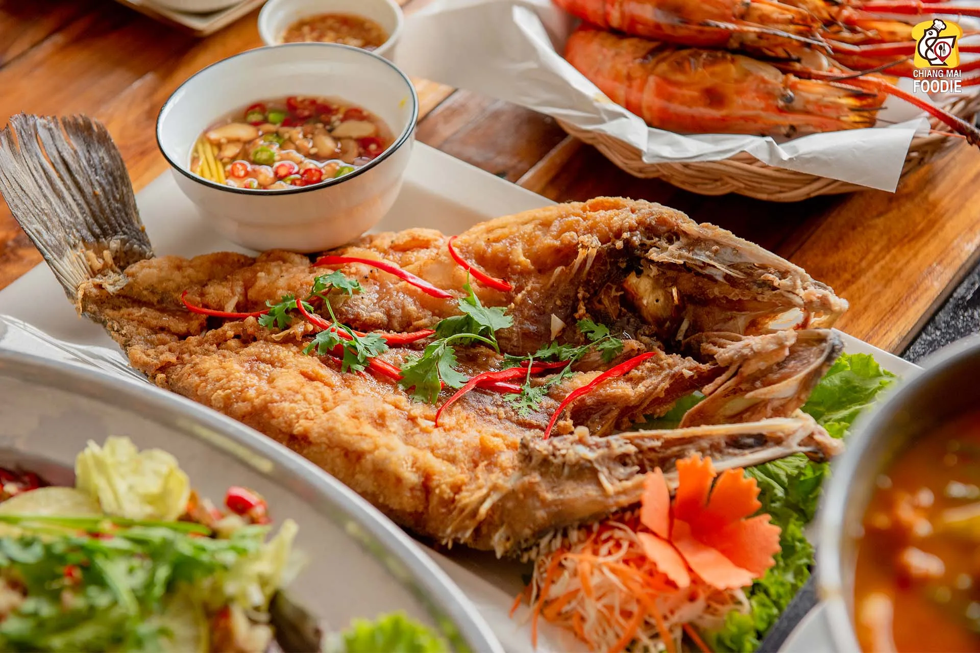 ปลากระพงทอดน้ำปลา: ปลาเนื้อแน่น หนังกรอบ ราดด้วยน้ำปลาสูตรเด็ดของทางร้าน ทานคู่กับข้าวสวยร้อนๆ อร่อยฟินสุดๆ