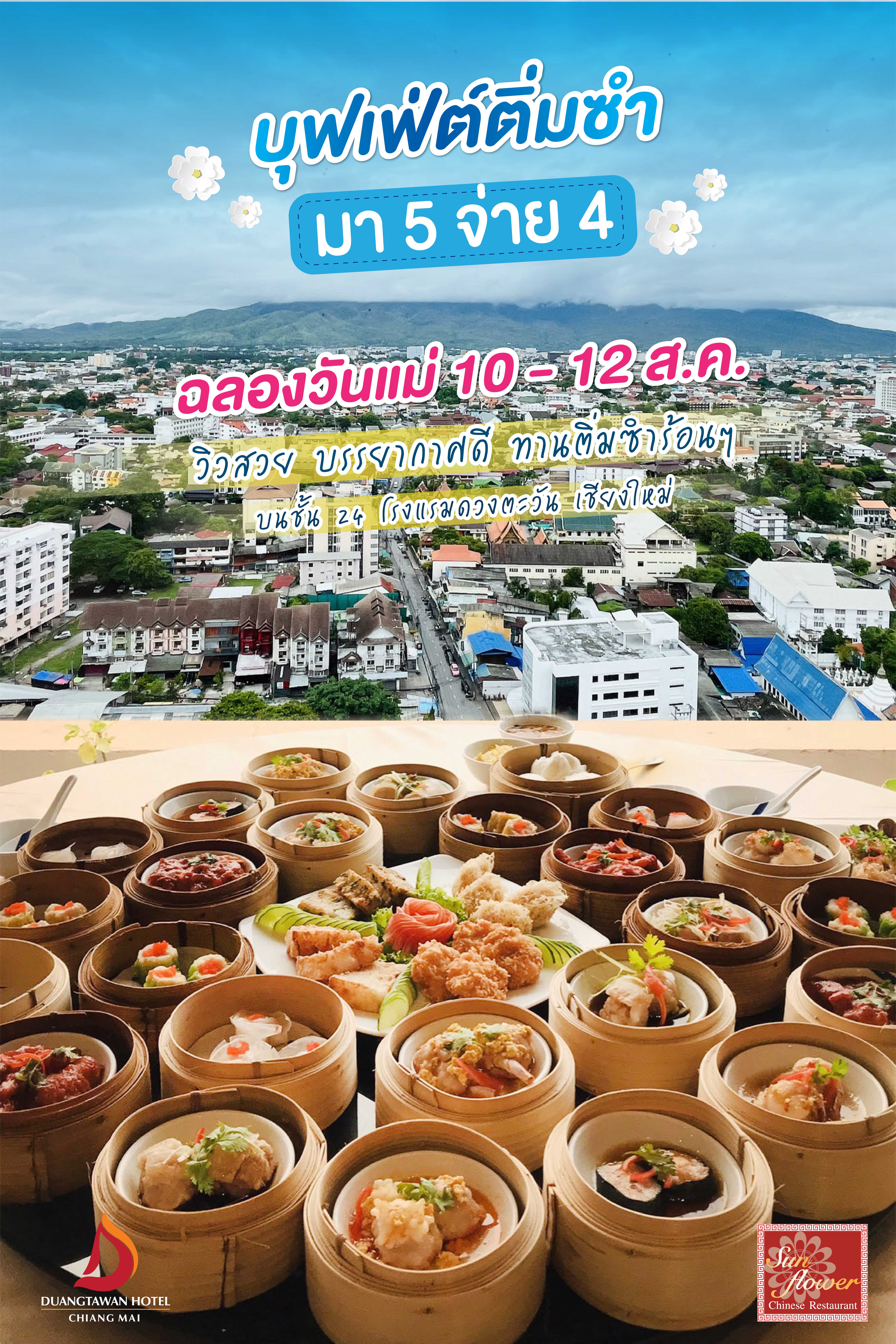 โรงแรมดวงตะวัน เชียงใหม่ ขอนำเสนออาหารจีนซันฟลาวเวอร์ บนชั้น 24 เป็นห้องอาหารจีนที่อยู่สูงที่สุดของเมืองเชียงใหม่ หรือภาคเหนือเลยก็ว่าได้ นอกจากจะอยู่สูงแล้ว รอบด้านของห้องเป็นกระจกใส ให้ท่านได้ชมทัศนียภาพของเมืองเชียงใหม่ และทิวเขาดอยสุเทพที่สวยงาม ชวนอิ่มอร่อยกับ บุฟเฟ่ต์ติ่มซำ หลากหลายเมนู ไว้รอทุกท่าน ช่วงวันแม่ 10-12 สิงหาคม 2567 นี้ เชิญชวนลูกๆ พาคุณแม่มาทานติ่มซำ พร้อมหน้าพร้อมตาครอบครัวอบอุ่น กับหลากหลายเมนูร้อนๆ อร่อย ไม่ซ้ำใคร อาทิ ถุงทอง,ทอดมันกุ้ง, ไก่จ๊อ, ปอเปี๊ยะทอด, ฮะเก๋ากุ้ง, ขนมจีบหยกกุ้ง, ขนมจีบหมู, กุ้งนึ่งพริกสามรส , สาหร่ายม้วนไส้กุ้ง, ปลาหมึกนึ่งผงกะหรี่, กรรเชียงปูสอดไส้ผงกะหรี่, ก๋วยเตี๋ยวหลอด,ซี่โครงหมูนึ่งเต้าซี่,ขาไก่นึ่งทรงเครื่อง, เนื้อปลานึ่งซีอิ๊ว, ซาลาเปาลาวา และไส้หมูสับ หรือไส้ครีม, ซุปเสฉวนทรงเครื่อง ,ข้าวผัดไก่ปลาเค็ม ผัดผักรวม ปิดท้ายกันด้วย ของหวาน เต้าฮวยฟรุ๊ตสลัด