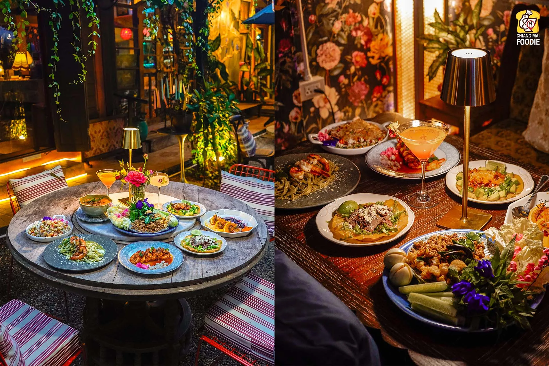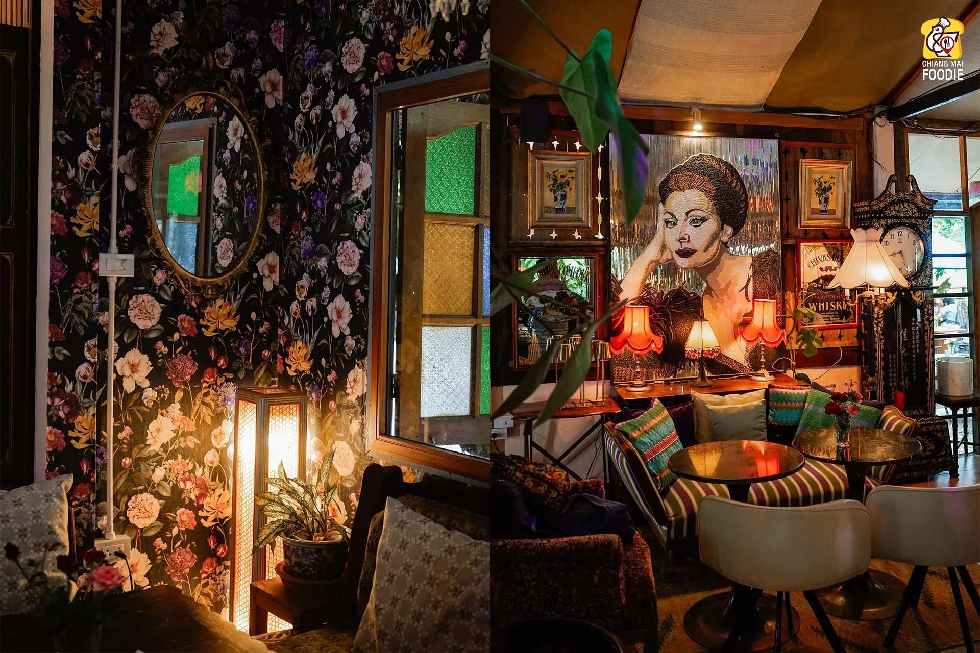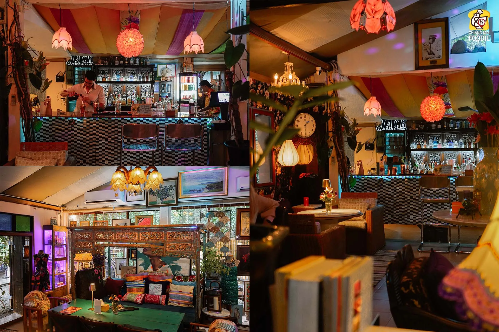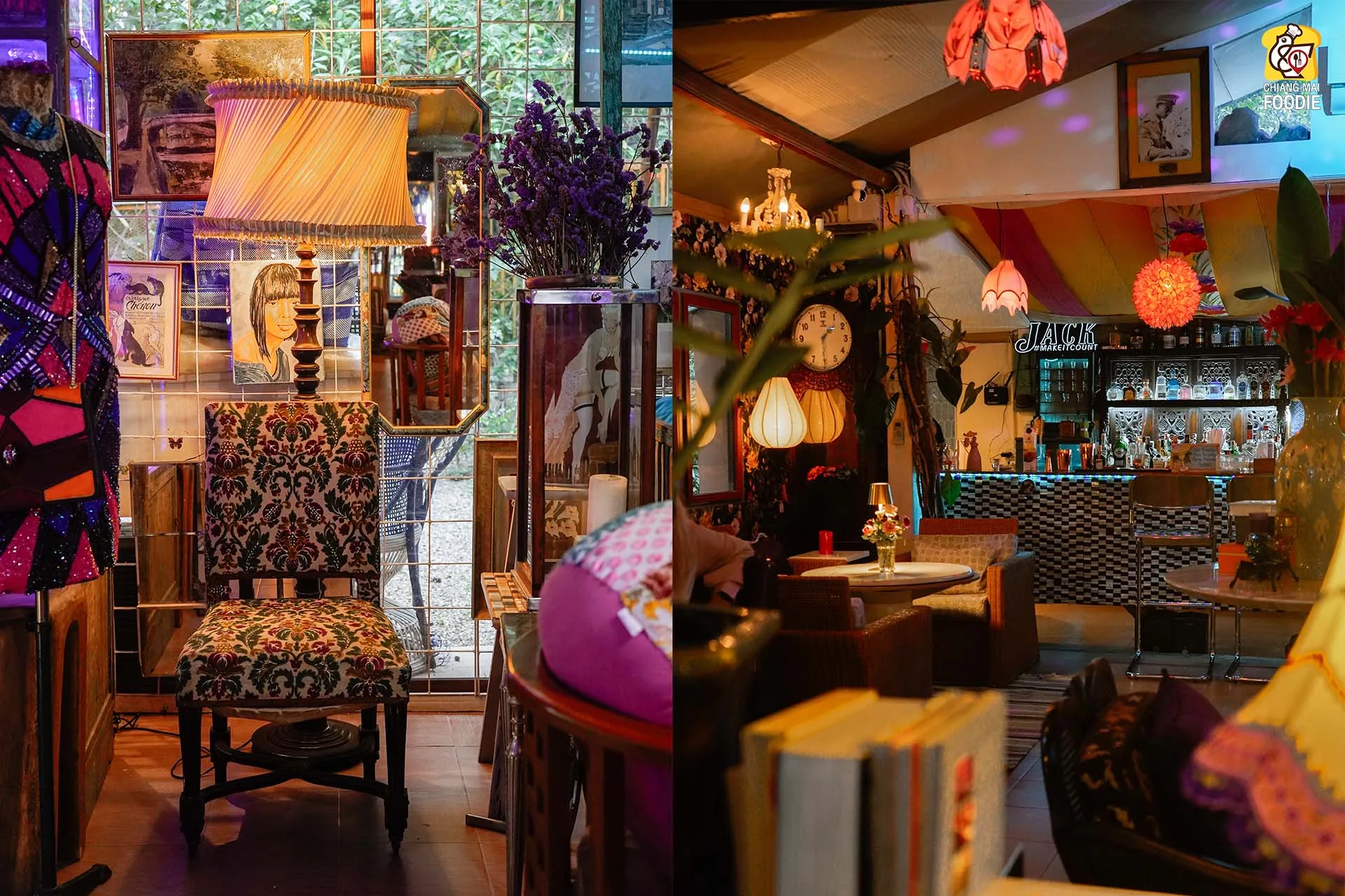 บอกเลยว่านี่คือร้านลับย่านแม่ริม และทำถึง! ทั้งอาหารตำรับไทย เทศ พร้อมกับบรรยากาศการตกแต่งร้านที่มีเสน่ห์เฉพาะตัว ที่นี่รวบเป็นทั้งร้านอาหาร เลาจน์ บาร์ เข้าด้วยกันอย่างลงตัวเลยค่ะ ชอบตรงที่ตกแต่งด้วยงานคราฟท์สีสันสดใสคละกันทั้งของตกแต่งแบบเรโทร และวินเทจ บวกกับความร่มรื่นท่ามกลางแมกไม้ บอกเลยว่าเราได้เสพความเป็นธรรมชาติพร้อมด้วยศิลปะที่น่ารักสุดๆ เหมาะทั้งมาดินเนอร์หวานๆ เปิดตี้กับเพื่อนฝูง หรือว่าจะพาครอบครัวมาทานมื้อค่ำถึงดึก
