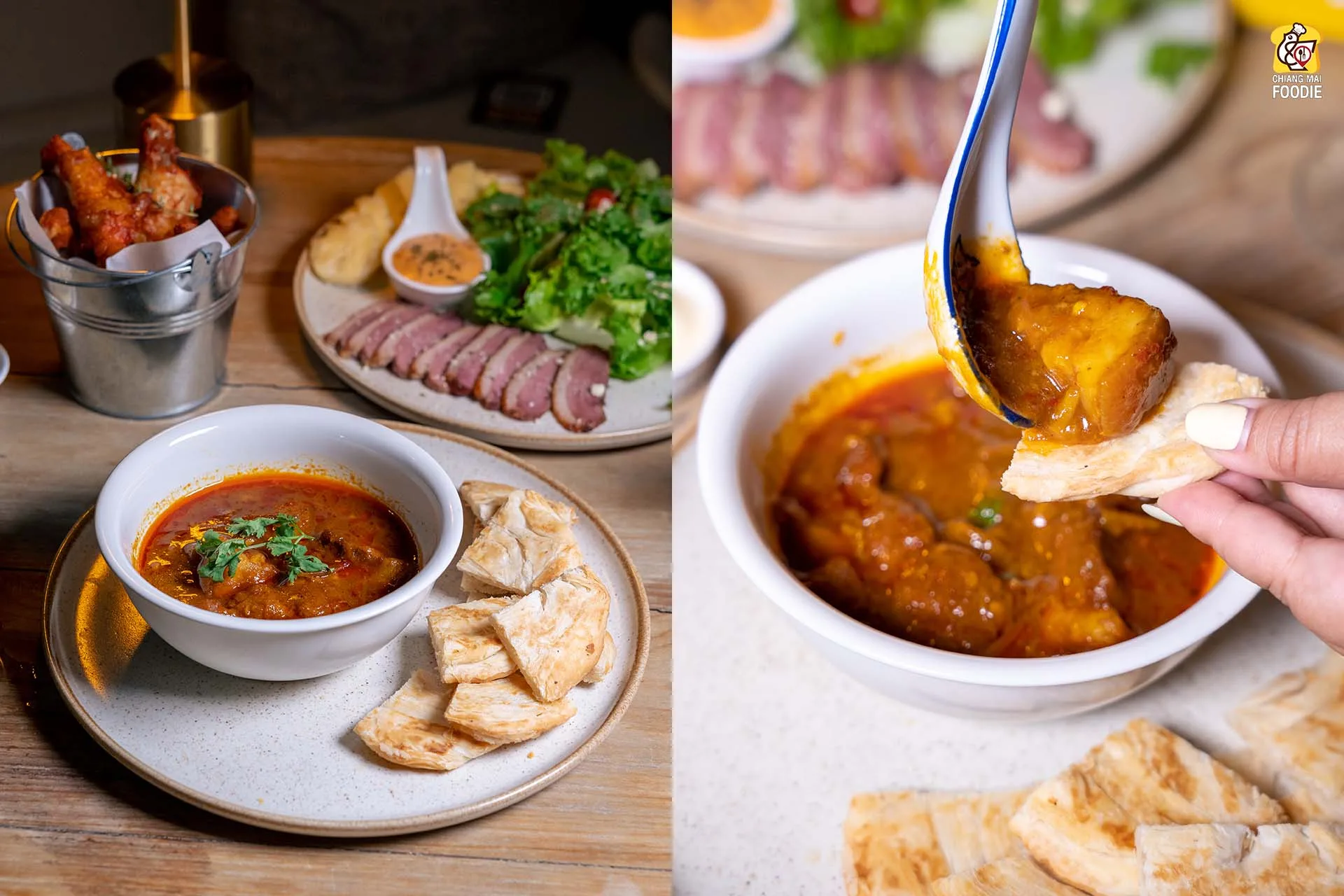 ใครยังไม่เคยมา จิ้มเมนูตามแอดมินได้เลยนะ ชอบที่สุดจะเป็น #แกงฮังเลกับแป้งโรตี เจ่เจ้ว่าเค้าทำตัวแป้งมาดีเลยหล่ะ หนากรอบสะใจสุดๆ ทานเปล่าก็เพลินนะ แต่ว่า ตัวฮังเลก็ให้มาแบบชิ้นใหญ่สาใจมาก หรือจะเป็นจานที่เพื่อสุขภาพเบาเบา อย่าง #อกเป็ดรมควัน ทานคู่กับสลัดผักสดหวานกรอบ