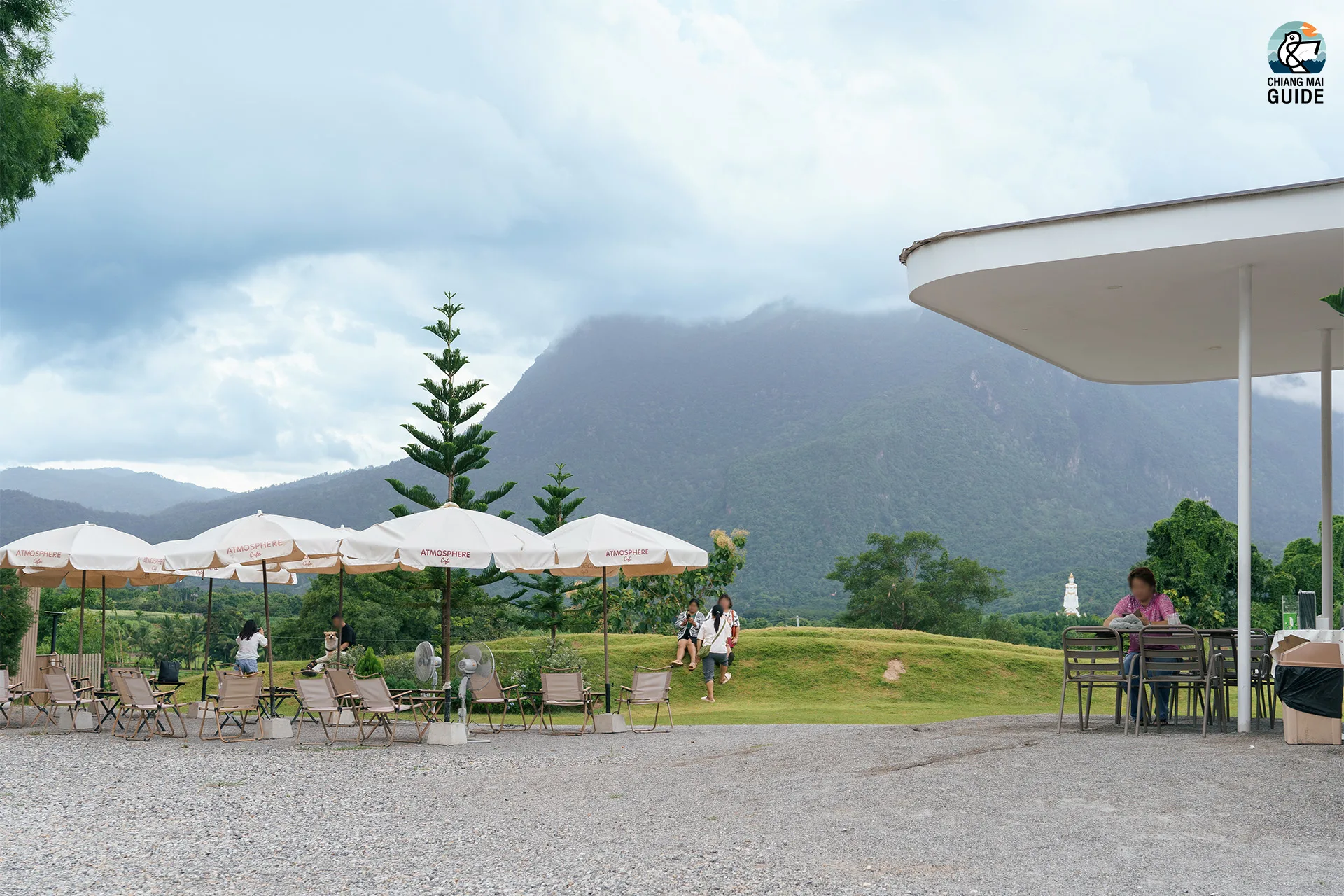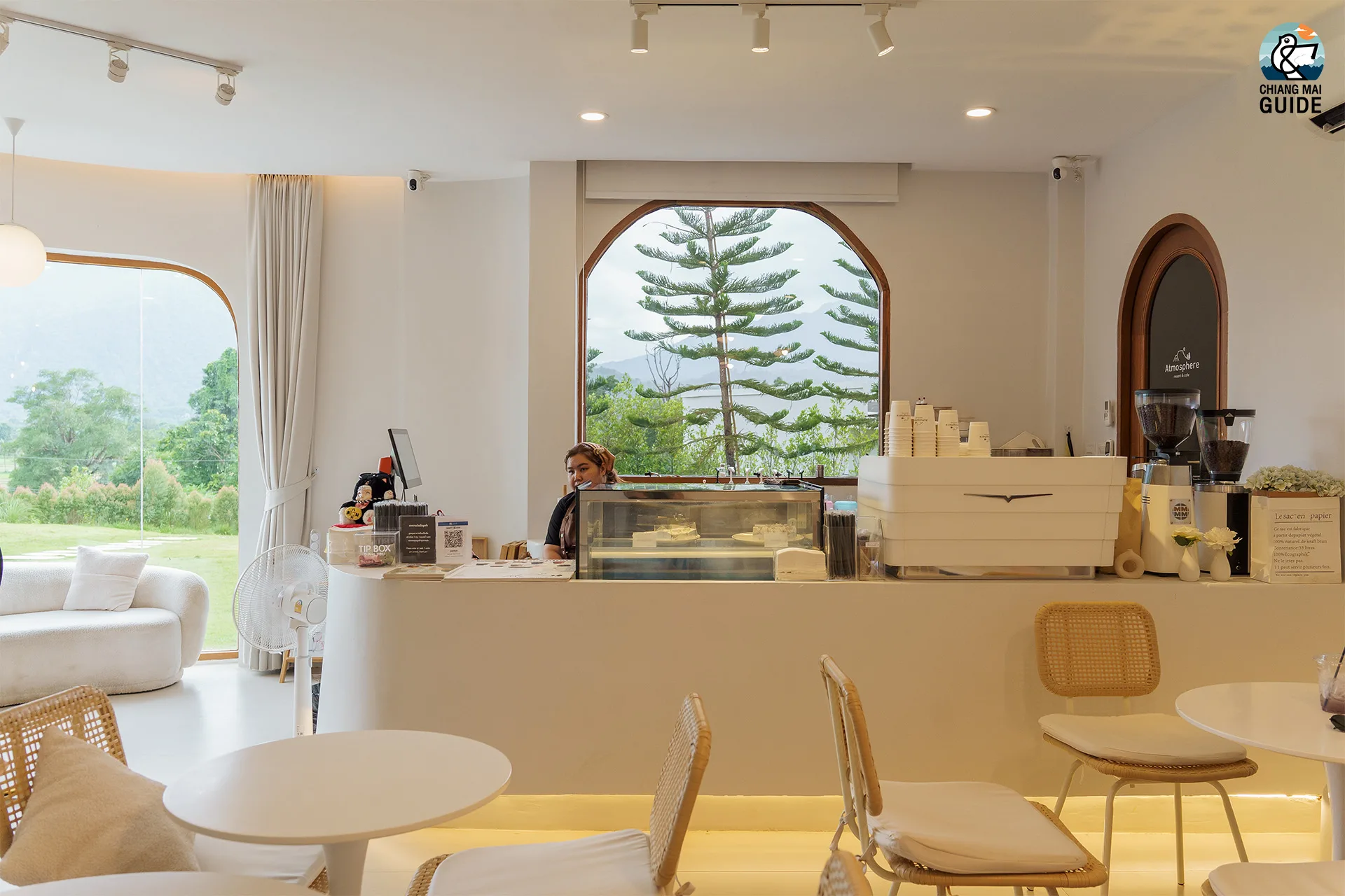 คาเฟ่ในโทนขาวคลีน เรียบแต่มีเสน่ห์ พร้อมมุมถ่ายรูปเยอะมาก ทั้งโซน indoor และ outdoor ที่มองออกไปก็เจอดอยหลวงแบบชัด ๆ 🏔