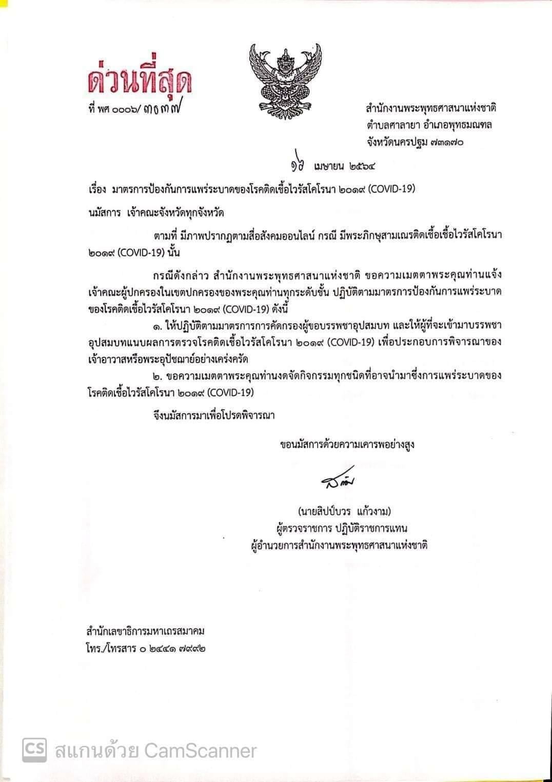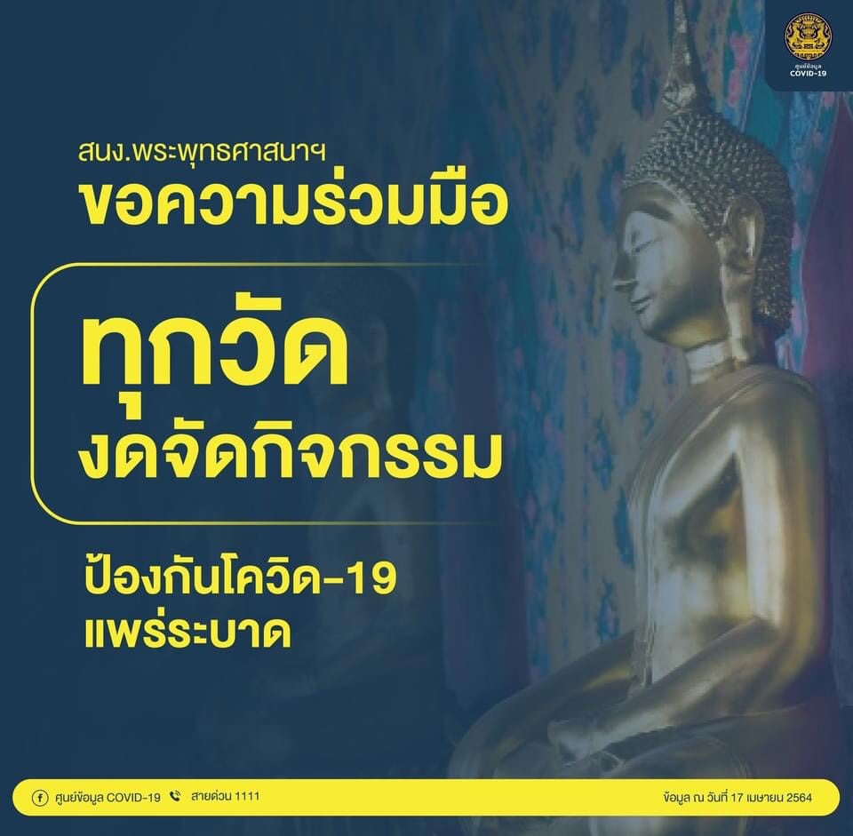 ขอความร่วมมืองดจัดกิจกรรมทุกชนิด ที่อาจก่อให้เกิดการแพร่ระบาดของโควิด -19 ได้ อีกทั้งให้ปฏิบัติตามมาตรการป้องกันโรคคัดกรองอย่างเคร่งครัด โดยสำนักงานพระพุทธศาสนาแห่งชาติ ออกหนังสือถึงเจ้าคณะจังหวัดทุกจังหวัดทั่วประเทศ