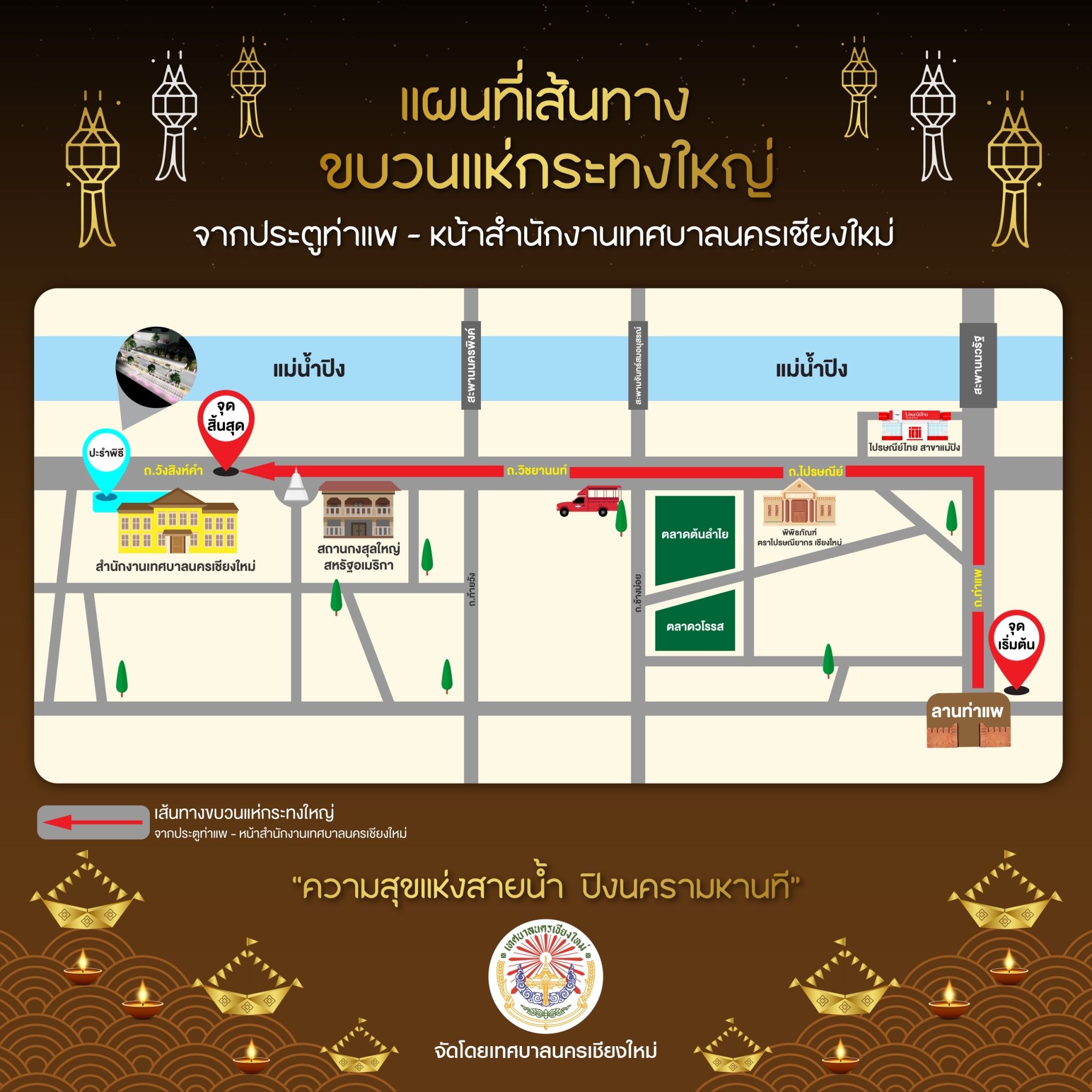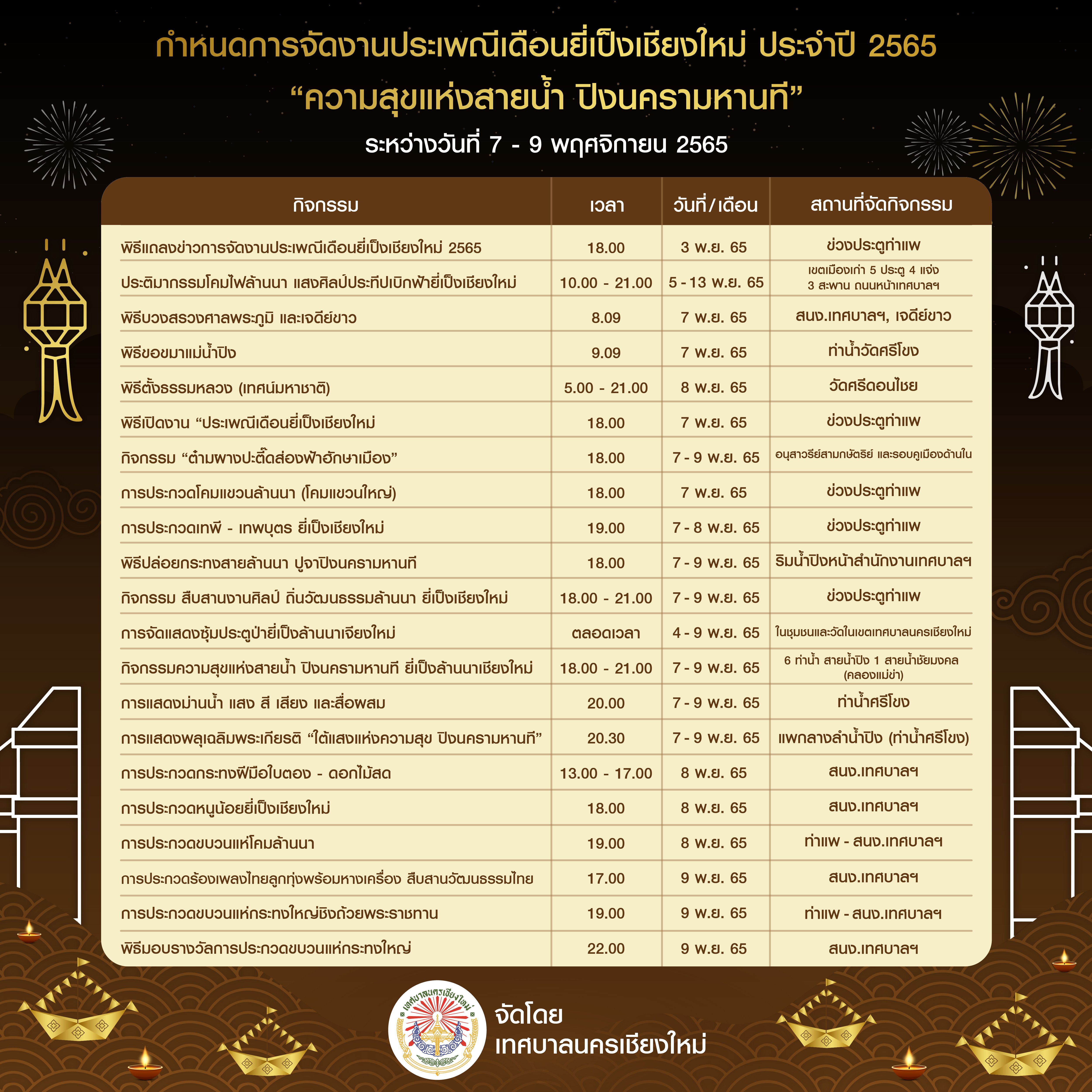เทศบาลนครเชียงใหม่ เชิญร่วมชมความอลังการและความสวยงามที่จะกลับมาอีกครั้ง กับสุดยอดงานประเพณียิ่งใหญ่แห่งปี หนึ่งเดียวของไทย งานประเพณียี่เป็งเชียงใหม่ ประจำปี 2565 “ความสุขแห่งสายน้ำ ปิงนครามหานที” จัดโดย เทศบาลนครเชียงใหม่ ระหว่างวันที่ 7 – 9 พฤศจิกายน 2565 นี้