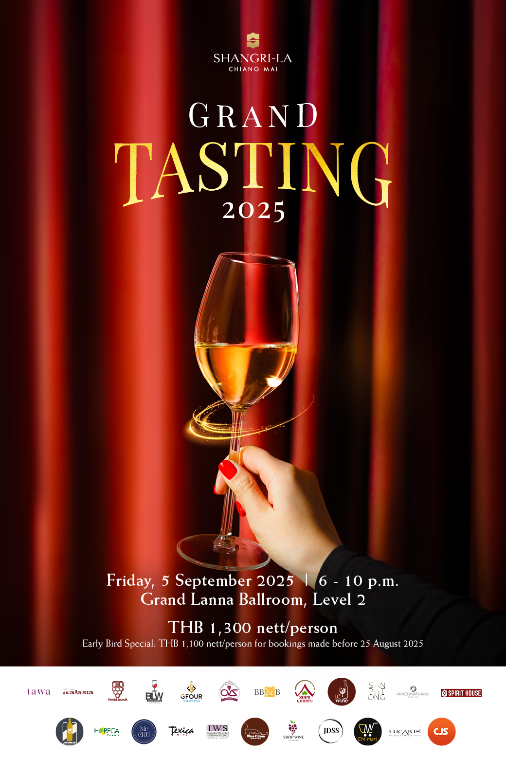 ภายในงานคุณจะได้สัมผัสกับเครื่องดื่มชั้นดีมากกว่า 150 ฉลาก จากหลากหลายประเทศที่ขึ้นชื่อในโลกของการหมักบ่ม ไม่ว่าจะเป็นจาก ฝรั่งเศส อิตาลี ออสเตรเลีย สเปน โปรตุเกส หรือเยอรมนีพร้อมเสิร์ฟคู่กับ อาหารทานเล่นสไตล์ทาปาส (Tapas) ที่รังสรรค์อย่างพิถีพิถัน เพื่อเติมเต็มค่ำคืนให้สมบูรณ์แบบในทุกมิติของรสชาติ