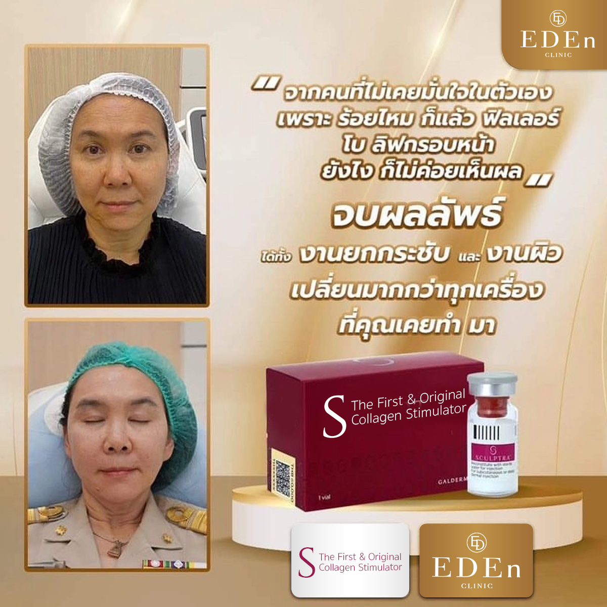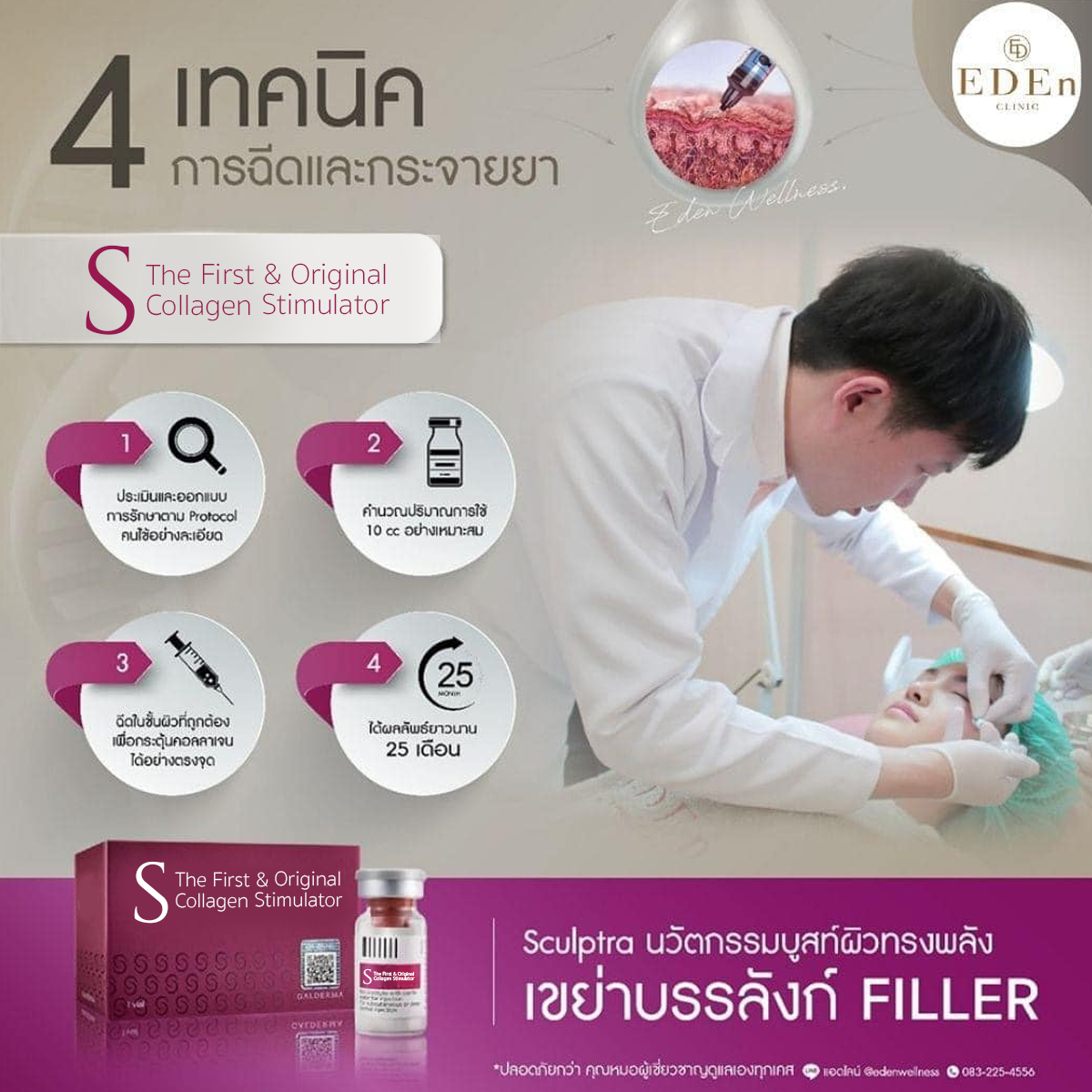 ที่กำลังมาแรง แบบฉุดไม่อยู่ในตอนนี้ ที่อีเดนคลินิกเรามีแพทย์ ผู้เชี่ยวชาญ ที่ศึกษา ฝึกฝน และเก็บเกี่ยวประสบการณ์มาอย่างยาวนาน จึงสามารถวิเคราะห์ปัญหาบนใบหน้าได้ เป๊ะ ตรงจุด และถูกต้องที่สุด ฉีกทุกกฎของFiller เพราะทำหน้าที่ได้ เท่ากับFillerทุกอย่าง แต่เหนือกว่าตรงที่สามารถ เติมเต็ม ยกกระชับ และกระตุ้นการผลิตของคอลลาเจนใต้ผิวหนังของเราเองขึ้นมาใหม่ตามธรรมชาติ อย่างปลอดภัย ทั้งนี้ เพื่อทดแทนคอลลาเจนที่สูญเสียไปตามอายุ นับได้ว่าเป็นอีกหนึ่งทางเลือกในการช่วยฟื้นฟูโครงสร้างผิว ชั้นลึก ที่ช่วยให้ผิวยกกระชับ คืนความแข็งแรง, ความยืดหยุ่น, ฟื้นคืนคุณภาพผิวให้ดูอ่อนเยาว์ลงอีกด้วย