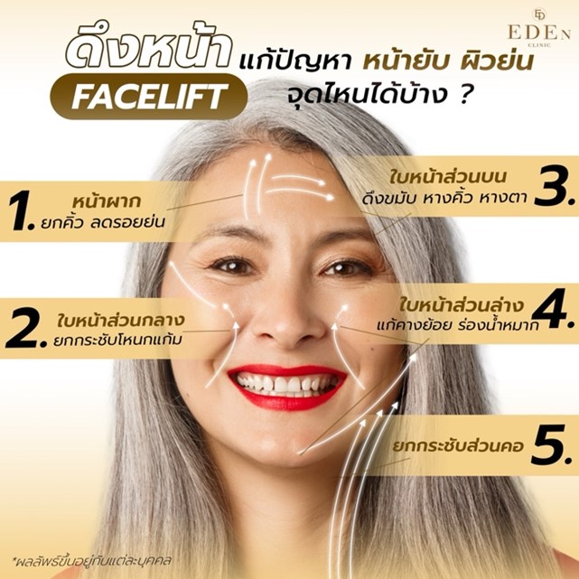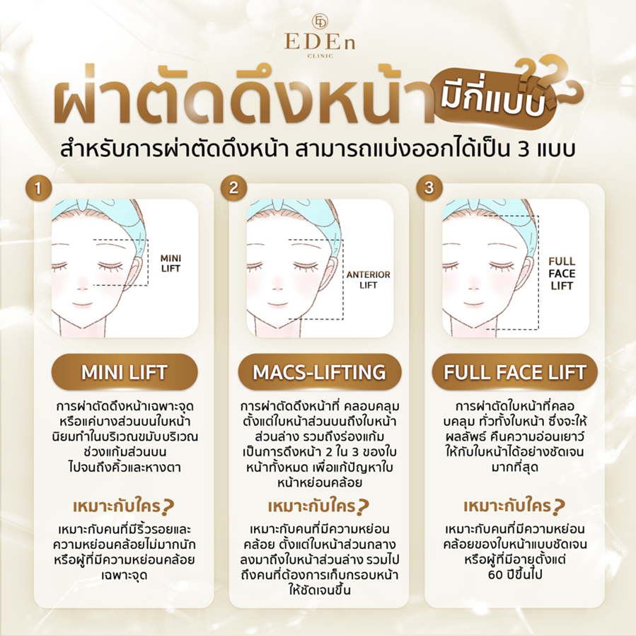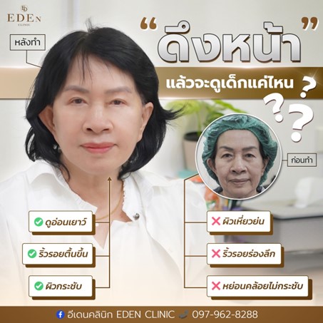 การแก้ไขความหย่อนคล้อยด้วยการผ่าตัดดึงหน้าผ่านการส่องกล้อง เป็นอีกหนึ่งทางเลือกที่นิยมมาก โดยเฉพาะในกลุ่มคนดัง อินฟลูเอ็นเซอร์ ที่อายุน้อยๆ (โดยเฉพาะการผ่าตัดดึงยกคิ้ว Foxy Eyes แก้ไขปัญหาตาตก) เนื่องจากได้ผลชัดเจนและคงอยู่ได้นานการผ่าตัดศัลยกรรมดึงหน้าในปัจจุบัน มีเทคนิคที่ทันสมัยช่วยให้การผ่าตัดเห็นผลลัพธ์ที่ดีมากๆ พักฟื้นไม่นาน เพียงสัปดาห์เดียวก็ยุบบวมแทบจะทั้งหมดแล้ว ที่อีเดนคลินิกมีศัลยแพทย์ผ่าตัดดึงหน้าเฉพาะที่มีประสบการณ์สามารถให้คำแนะนำ และออกแบบการผ่าตัดให้ได้ผลลัพธ์ที่สวยงาม ดูเป็นธรรมชาติ และปลอดภัย