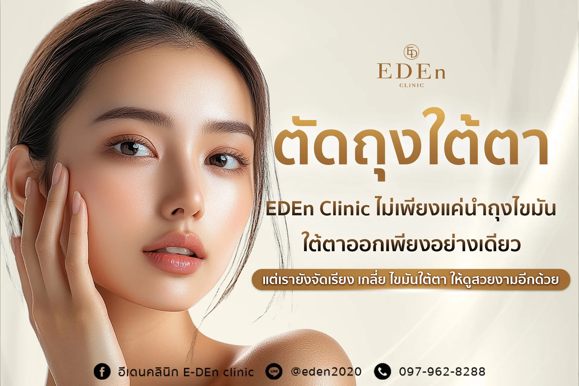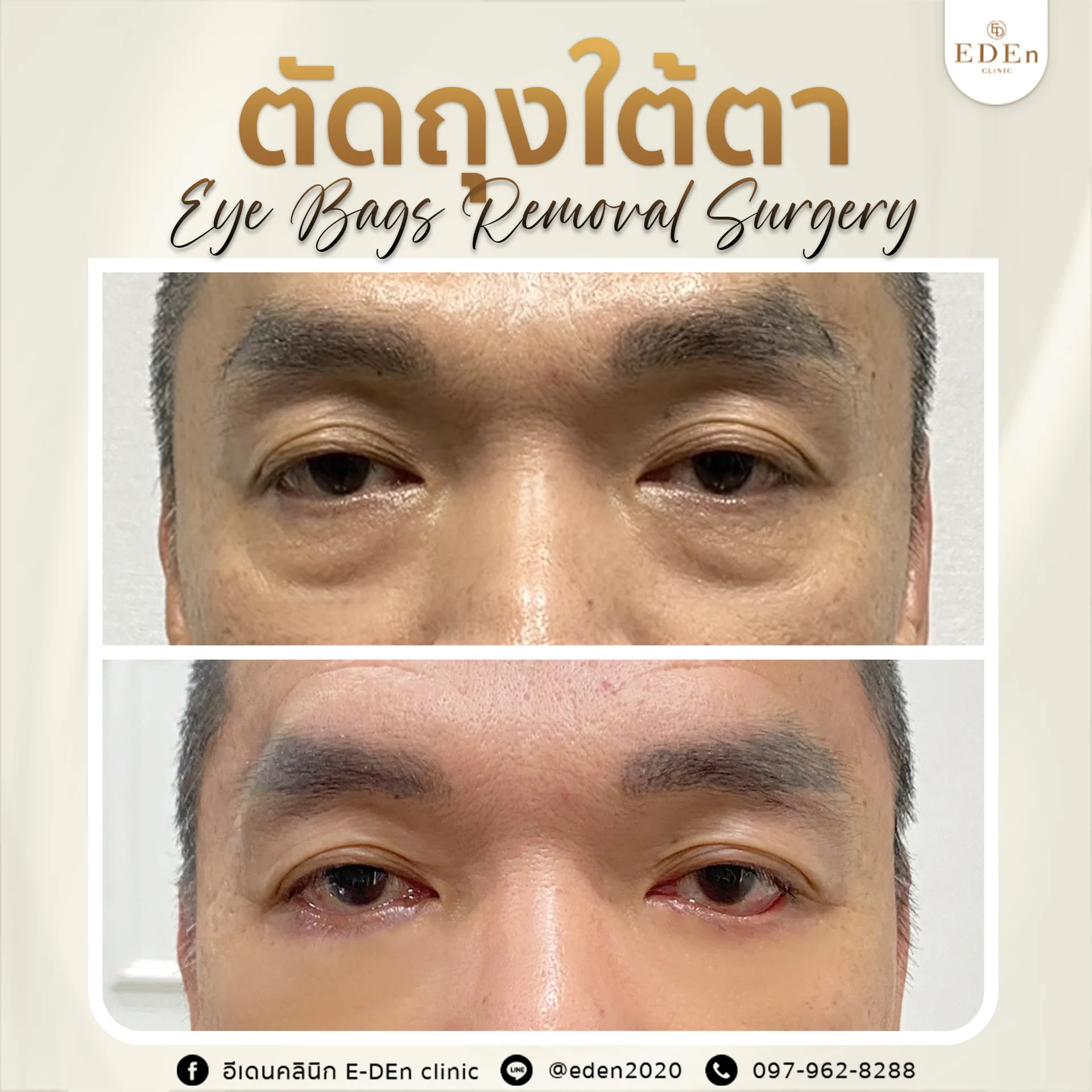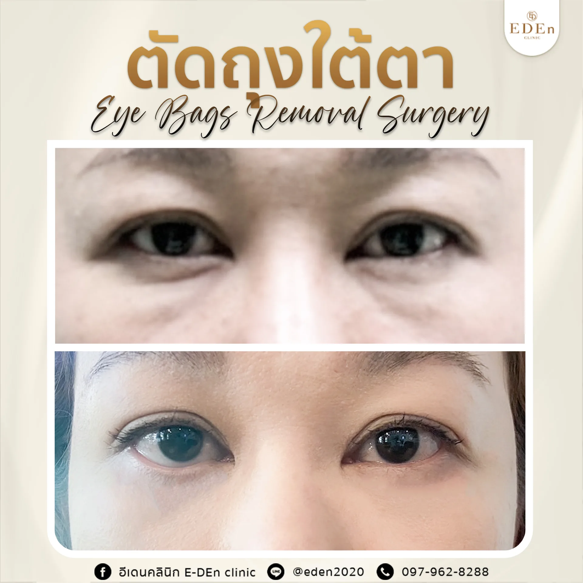 แต่ที่อีเดนคลินิกเราไม่เพียงแค่นำถุงไขมันใต้ตาออกเพียงอย่างเดียวแต่เรายังจัดเรียง เกลี่ย ไขมันใต้ตาให้ดูสวยงามอีกด้วย เพราะถ้าหากแค่ตัดออกเพียงอย่างเดียว อาจจะทำให้ไม่มีอะไรช่วยพยุงใต้ตา และจะสามารถทำให้ใต้ตาดูลึก โบ๋ ซึ่งก็เป็นอีกหนึ่งสาเหตุของการที่ทำหน้าดูแก่เช่นกัน