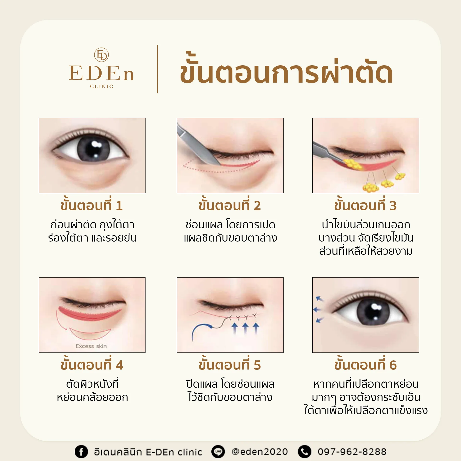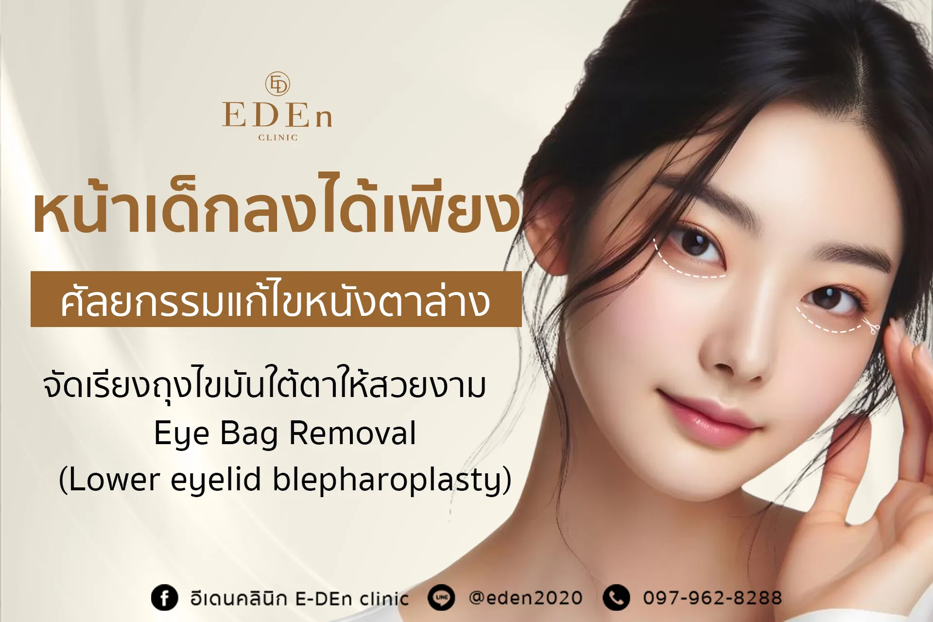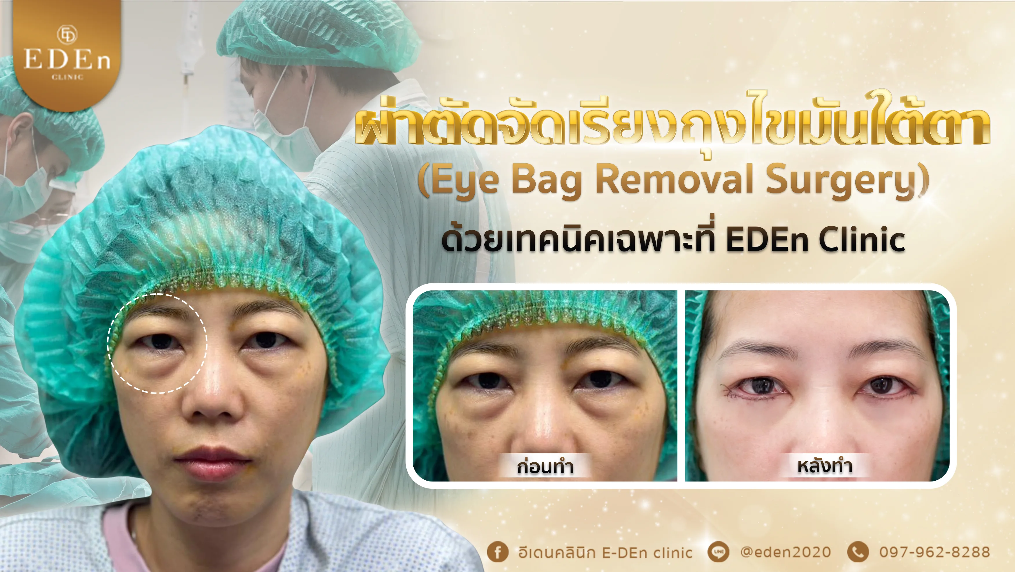 แต่ที่อีเดนคลินิกเราไม่เพียงแค่นำถุงไขมันใต้ตาออกเพียงอย่างเดียวแต่เรายังจัดเรียง เกลี่ย ไขมันใต้ตาให้ดูสวยงามอีกด้วย เพราะถ้าหากแค่ตัดออกเพียงอย่างเดียว อาจจะทำให้ไม่มีอะไรช่วยพยุงใต้ตา และจะสามารถทำให้ใต้ตาดูลึก โบ๋ ซึ่งก็เป็นอีกหนึ่งสาเหตุของการที่ทำหน้าดูแก่เช่นกัน